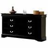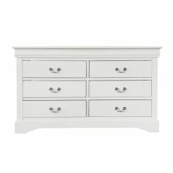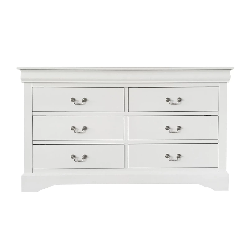 This Louis Philippe III dresser comes in black in cherry in white in and antique gray finish. Features six drawers that provide ample space to store your clothing in bedding and linens. All drawers have brushed nicked metal hardware and center metal glides. This beautiful dresser will be the perfect complement from the most sophisticated to decor casual settings. Material:Wood (Solid Pine) in Wood Veneer (Gum) in MDF in PB