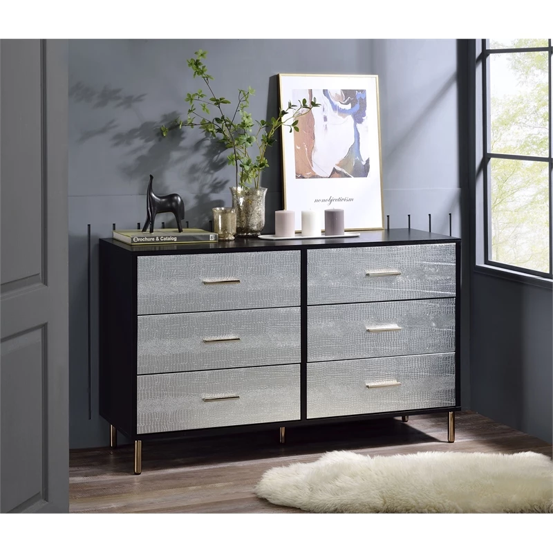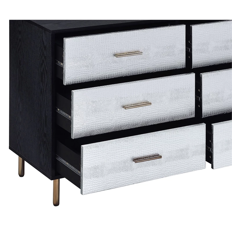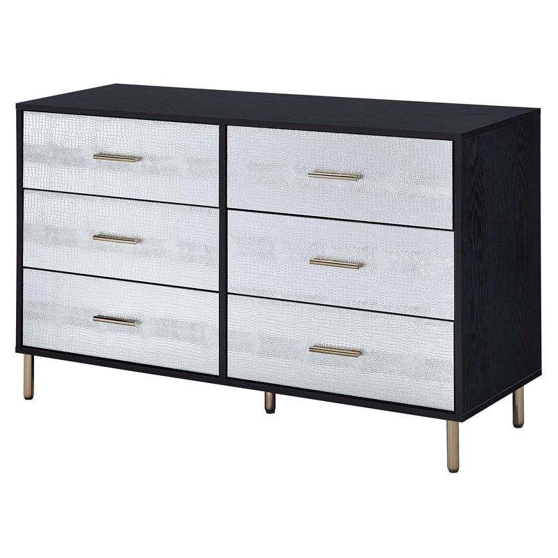 Glamorous elements come together in this contemporary modern six-drawer dresser. This long and spacious dresser is designed with metallic accents and a charming two-tone frame along the chest, creating a style for your bedroom storage piece. Accented with metallic touches. Each of the six spacious drawers is covered in a crocodile skin embossed material and glides open with the assistance of lustrous slim metal pulls. Slim tubular legs, including an extra center leg for support, make this contemporary dresser a long-lasting bedroom furniture piece.