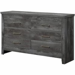 Simple and extremely rustic, the Vidalia Dresser conveys the character of rugged simplicity in living close to nature while maintaining stylish comfort. A clean-lined cuboid body stands on a wooden sled base. Gray oak finish paints the whole casegood, enhacing the surface with beautiful wood texture . There are six storage drawers with metal bar pulls for extra style and storage space. Let the Vidalia Dresser take you back to a carefree era when life was tranquil and relaxing was easy.