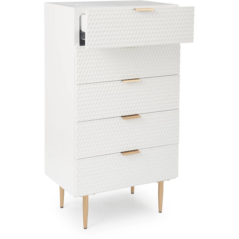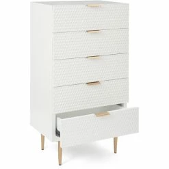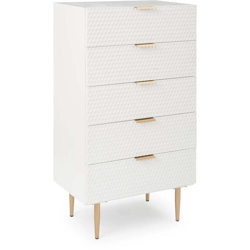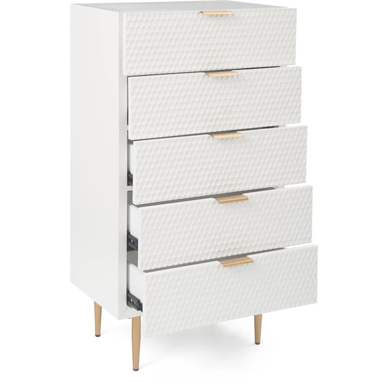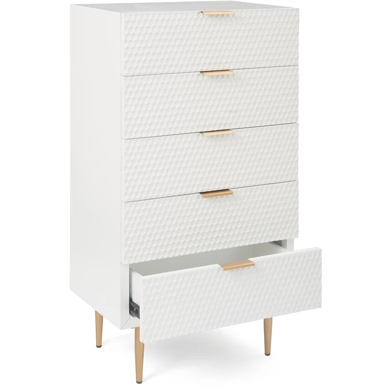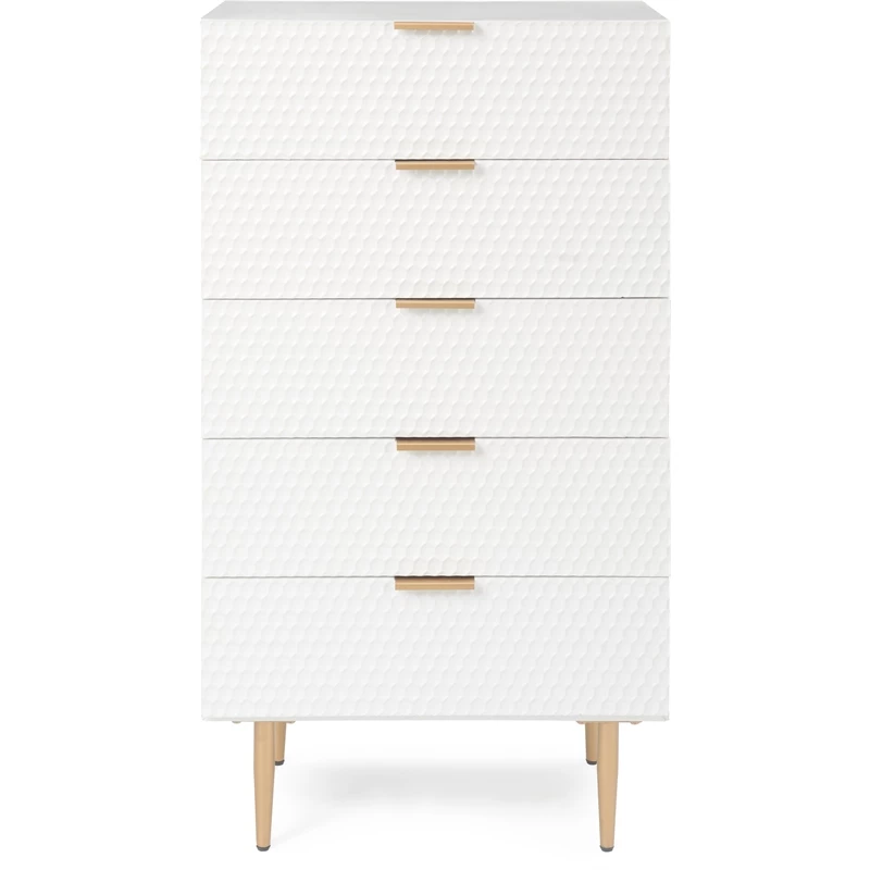 Make any space photo-worthy with this modern five drawer dresser. The clean lines and detailed touches of this stylish dresser, such as the honeycomb texture and gold metal accents, allow it to seamlessly mesh into any type of contemporary decor.