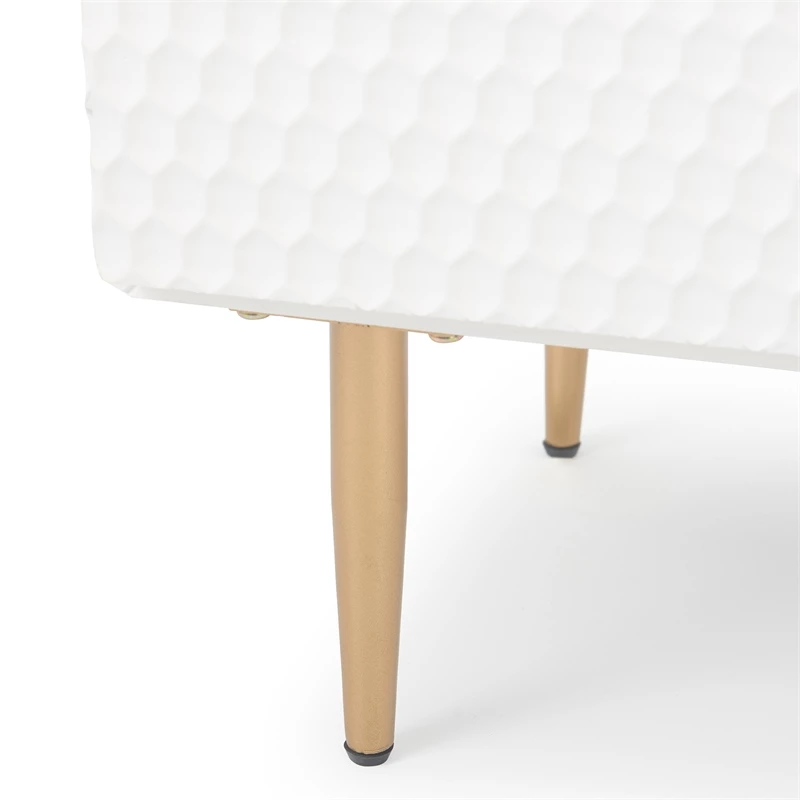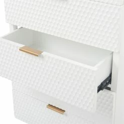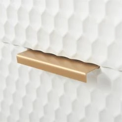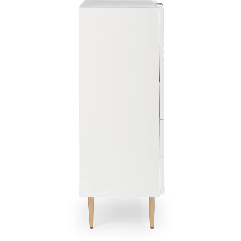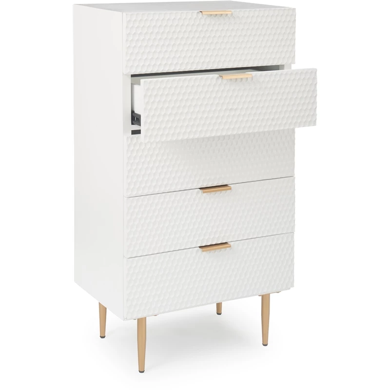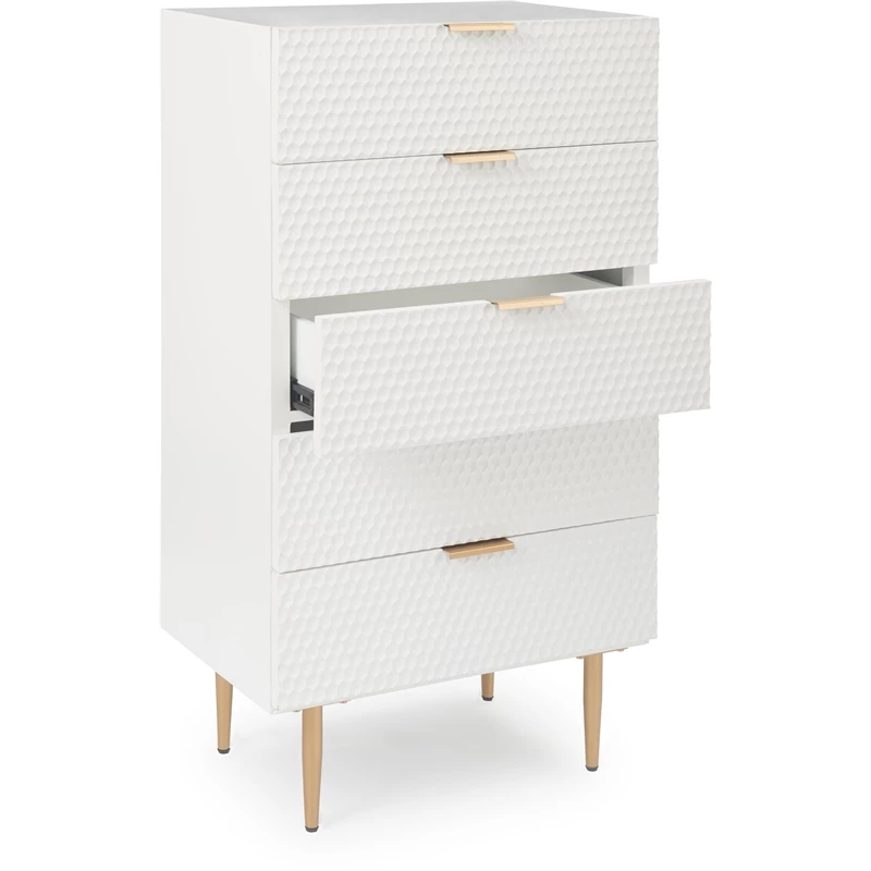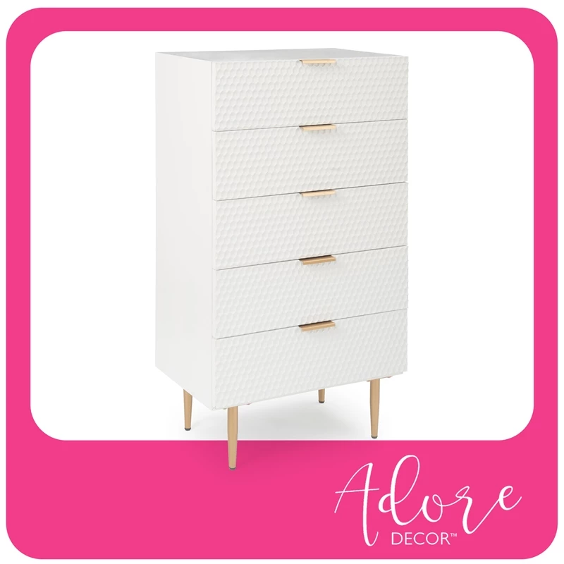 Make any space photo-worthy with this modern five drawer dresser. The clean lines and detailed touches of this stylish dresser, such as the honeycomb texture and gold metal accents, allow it to seamlessly mesh into any type of contemporary decor.