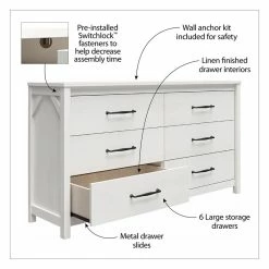 The Augusta Collection by Ameriwood Home is the rustic bedroom collection you’ve been searching for. With classic black hardware, distressed wood grain patterns, and barn door inspired accents, our design team has carefully crafted each detail to make farmhouse style easy to attain. Made from engineered distressed wood and constructed with our new SwitchLock ™ Assembly System and preassembled drawer slides to cut assembly time nearly in half. The Augusta Wide dresser features 6 spacious drawers to neatly organize all your belongings. The Wide Dresser ships flat to your door and requires two adults to assemble. Once assembled, the Dresser measures to be 32.3” H x 59.7” W x 15.7” D.