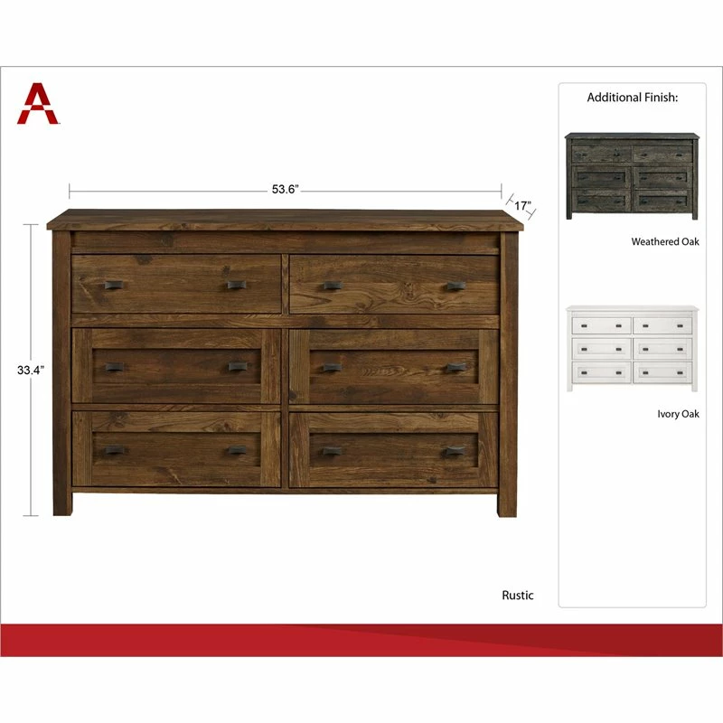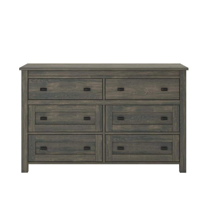 Give your bedroom a beautiful rustic style makeover with the Ameriwood Home Farmington 6 Drawer Dresser. Made from MDF and particleboard, this farmhouse-style design highlights the rustic brown with gray undertones you would see in an old barn or popular reclaimed pieces of furniture.