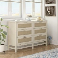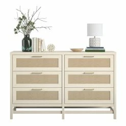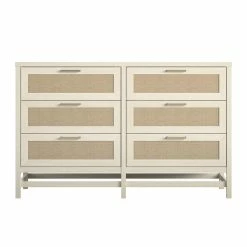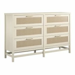 Clean up the clutter in your closet with the boho-chic Ameriwood Home Lennon 6 Drawer Dresser. The 6 drawers can store away t-shirts, socks, and jeans to free up space in your closet. Each drawer features durable metal slides for a smooth gliding drawer. Made of laminated MDF and particleboard, the Off White woodgrain finish pairs with the faux rattan drawer fronts for a fun coastal look. A wall anchor kit is included to secure the Dresser to the wall and prevent tipping injuries. The Dresser ships flat to your door and requires assembly upon opening. Two adults are recommended to assemble. Once assembled, the Dresser measures to be 37.28”H x 59.37”W x 15.67”D.
