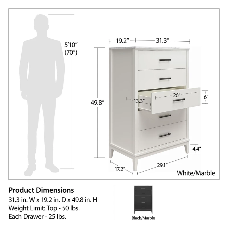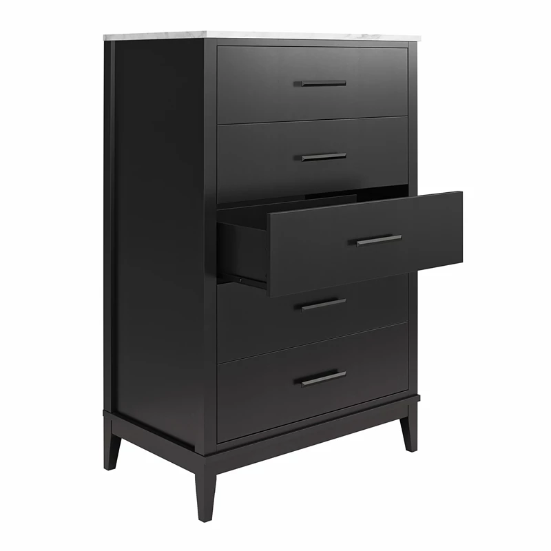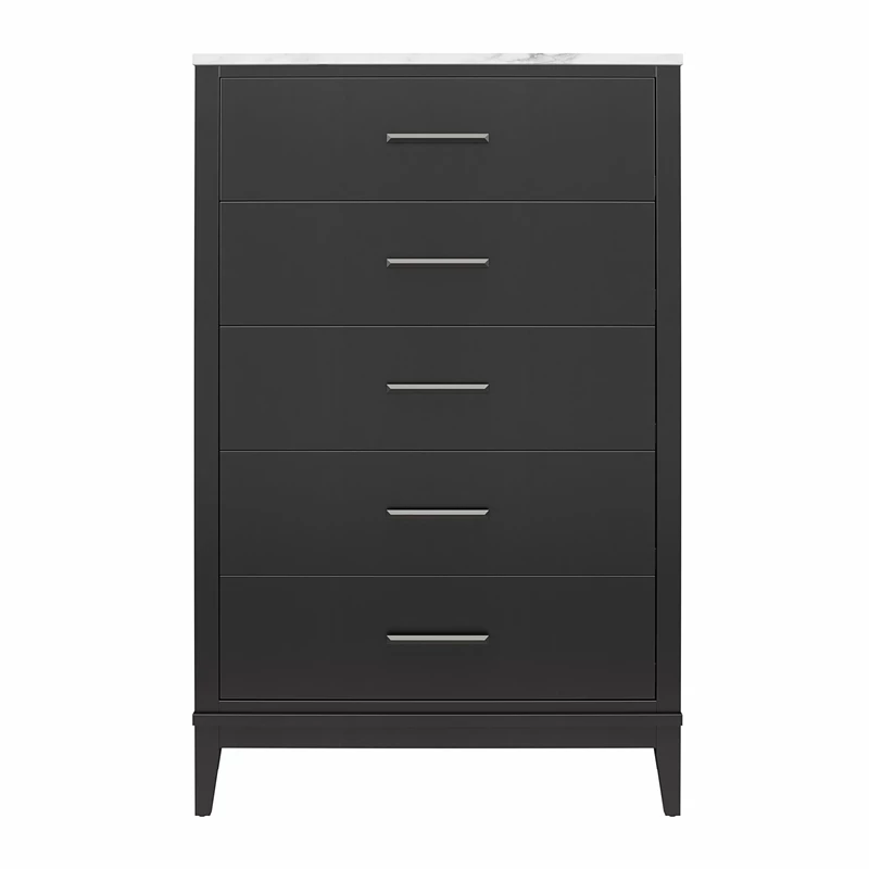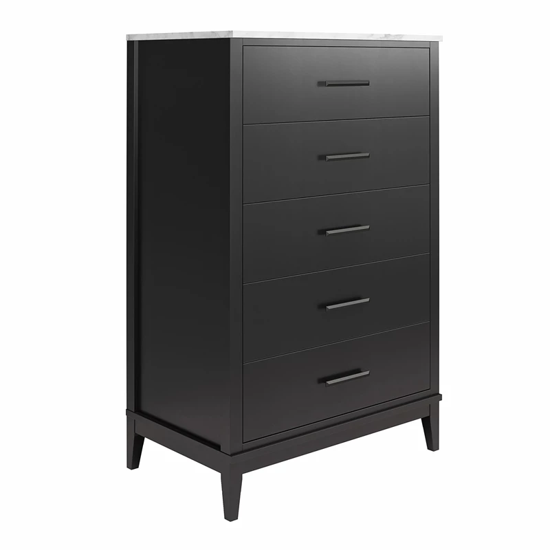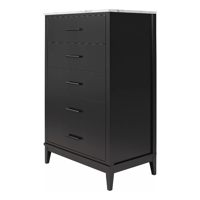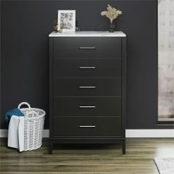 Hot Sale 🥰 Ameriwood Home Lynnhaven Tall 5 Drawer 👗 Dresser In Black W/ White Marble Top 🌟