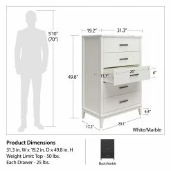 Upgrade your space with the luxurious and modern Lynnhaven collection from Ameriwood home. Stunning white and gray faux marble tops mixed with painted MDF engineered wood create a soothing and sophisticated bedroom ensemble. Give your closet some relief by storing your belongings in this space saving Tall 5 Drawer Dresser with durable metal slides. Tapered legs and elongated hardware pull this piece together to create a must-have bedroom look that will have you sleeping in. The Tall 5 Drawer Dresser ships flat in one box. Assembly is required. Two adults are recommended to assemble. Once assembled, the Dresser measures to be 31.3” W x 19.2” D x 49.8” H.