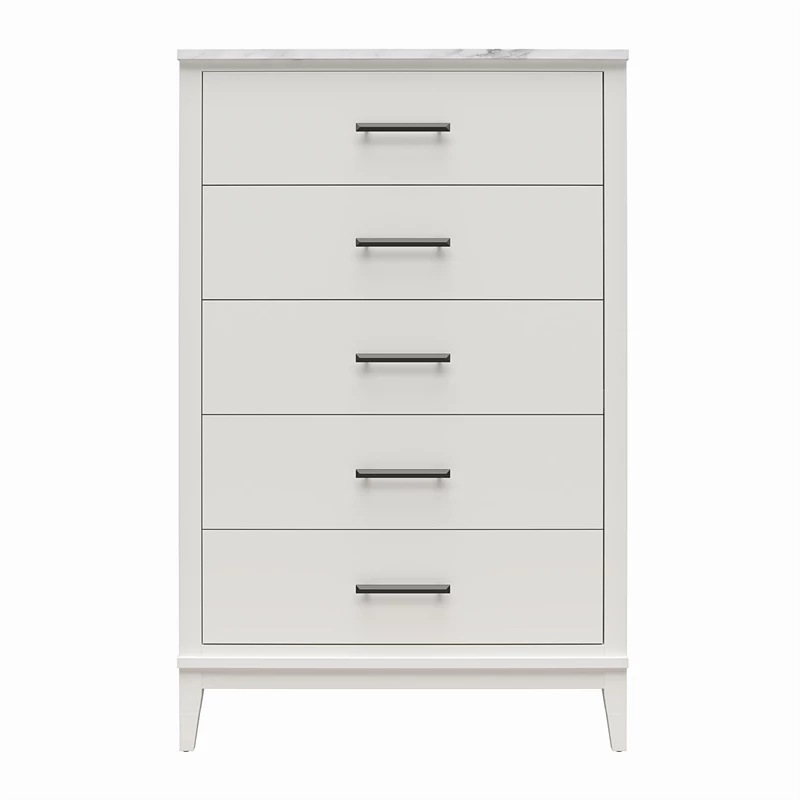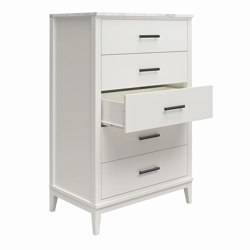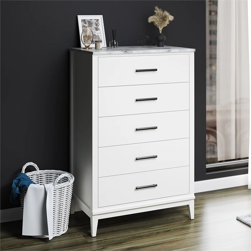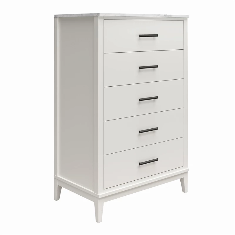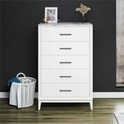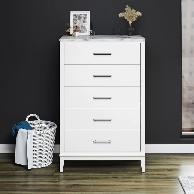 Outlet 🎉 Ameriwood Home Lynnhaven Tall 5 Drawer 👗 Dresser In White W/ White Marble Top 👏