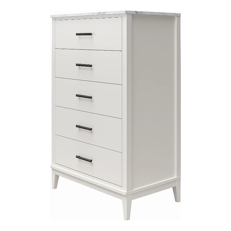 Upgrade your space with the luxurious and modern Lynnhaven collection from Ameriwood home. Stunning white and gray faux marble tops mixed with painted MDF engineered wood create a soothing and sophisticated bedroom ensemble. Give your closet some relief by storing your belongings in this space saving Tall 5 Drawer Dresser with durable metal slides. Tapered legs and elongated hardware pull this piece together to create a must-have bedroom look that will have you sleeping in. The Tall 5 Drawer Dresser ships flat in one box. Assembly is required. Two adults are recommended to assemble. Once assembled, the Dresser measures to be 31.3” W x 19.2” D x 49.8” H.
