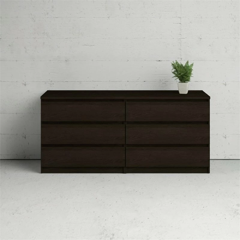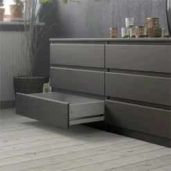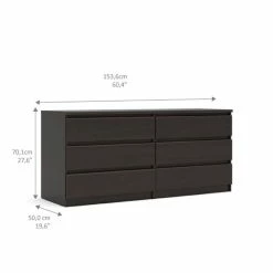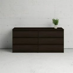 With ample storage space in its 6 roomy drawers double dresser is an easy way to keep your belongings organized. From delicates to bulky items Atlin Desisgns 6 drawer double dresser can store various items while offering a modern, sleek look that merges seamlessly with any décor. With metal drawer glides and maple drawer interiors for smooth movement the chest is a sturdy, yet simply designed piece. The finish is easy to clean, water, scratch, and stain resistant making it an ideal choice for families or college Living.