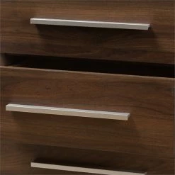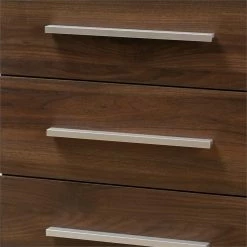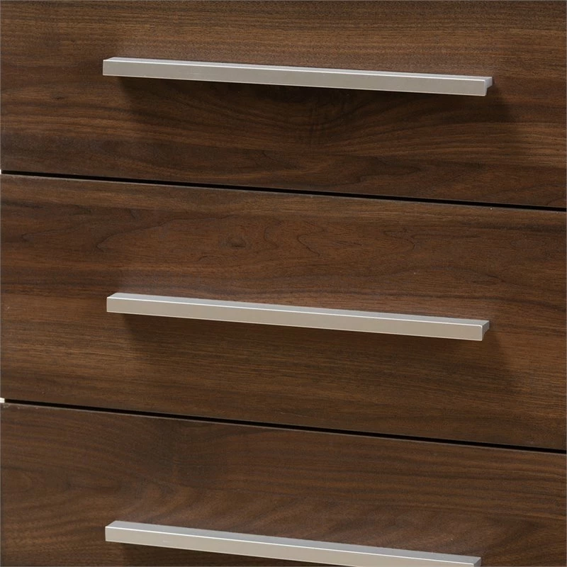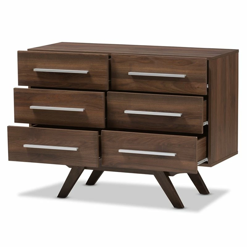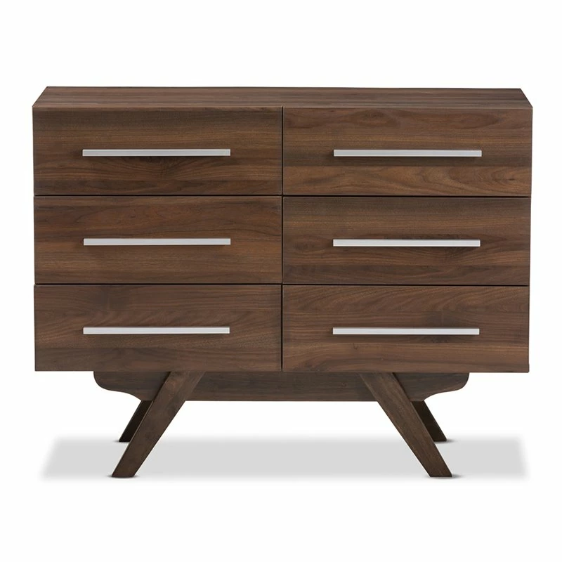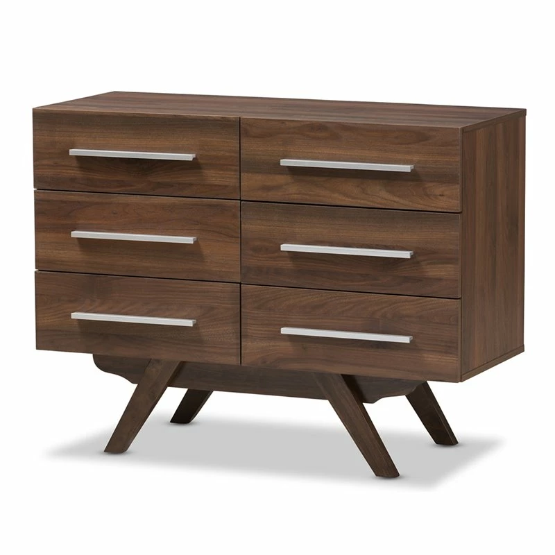 Sleek design with angular legs for sculptural design balancing, the Auburn 6-drawer dresser presents your everyday space with ample storage. Constructed of engineered wood and MDF boards for sturdiness, the dresser features six drawers, on pre-install drawer slides for your clothes and linens. Powder-coated handle offers a sleek and modern aesthetic in your space. Solid rubber wood legs provide strong structural supports. Walnut or espresso brown veneered finishing complements a range of interior palettes and styles, from retro and Scandinavian to coastal and urban styles. Made in Malaysia, the Auburn requires assembly.