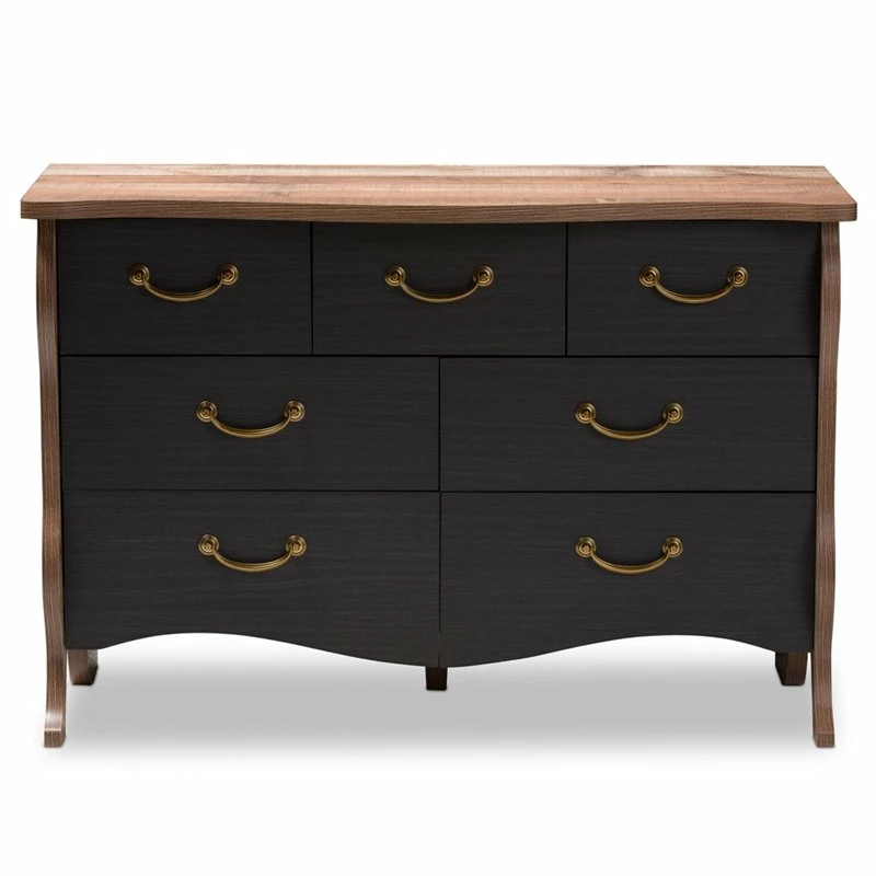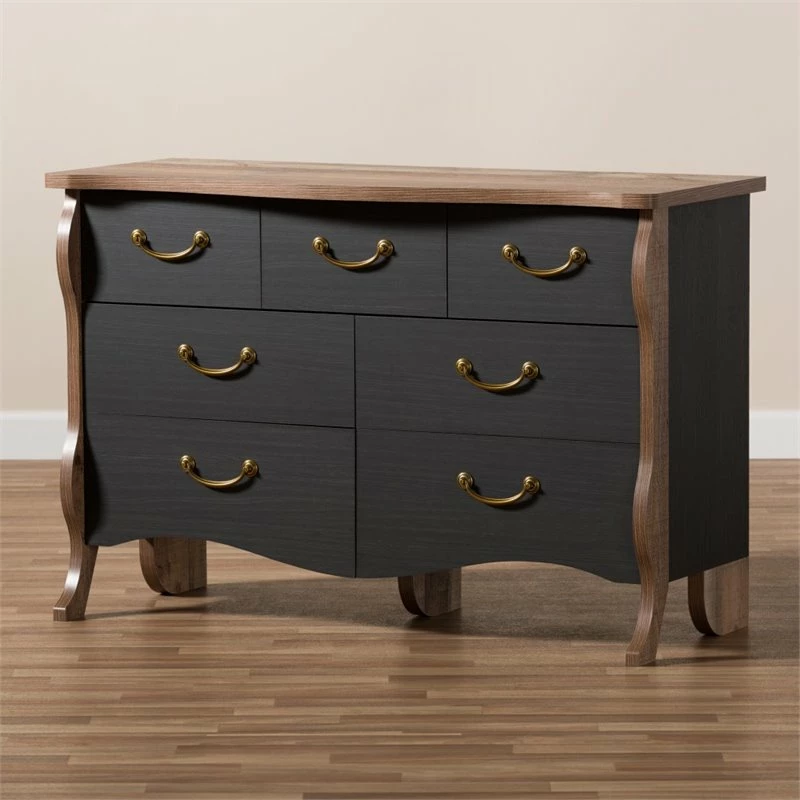 The Romilly 7-drawer dresser is an exciting spin on a traditional look. The country cottage and farmhouse-inspired design is evident in the serpentine curves of the frame and attention to detail. The two-tone finish is where the updated look of this dresser comes in. The sides and drawers of the dresser are finished in black, contrasting and complementing the oak finish of the wings and top of the dresser. All seven drawers of the Romilly easily pull out on rolling slides. The drawer features charming gold-finished metal drawer pulls with ornate grooves for extra detail. The Romilly is dynamic and can be coordinated with a wide range of decor, from rustic and French styles all the way through contemporary. Add this versatile charm to your bedroom, guest room, nursery, or any space needing storage and style. Made in Malaysia, the Romilly requires assembly.