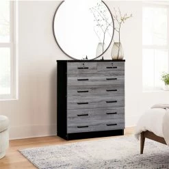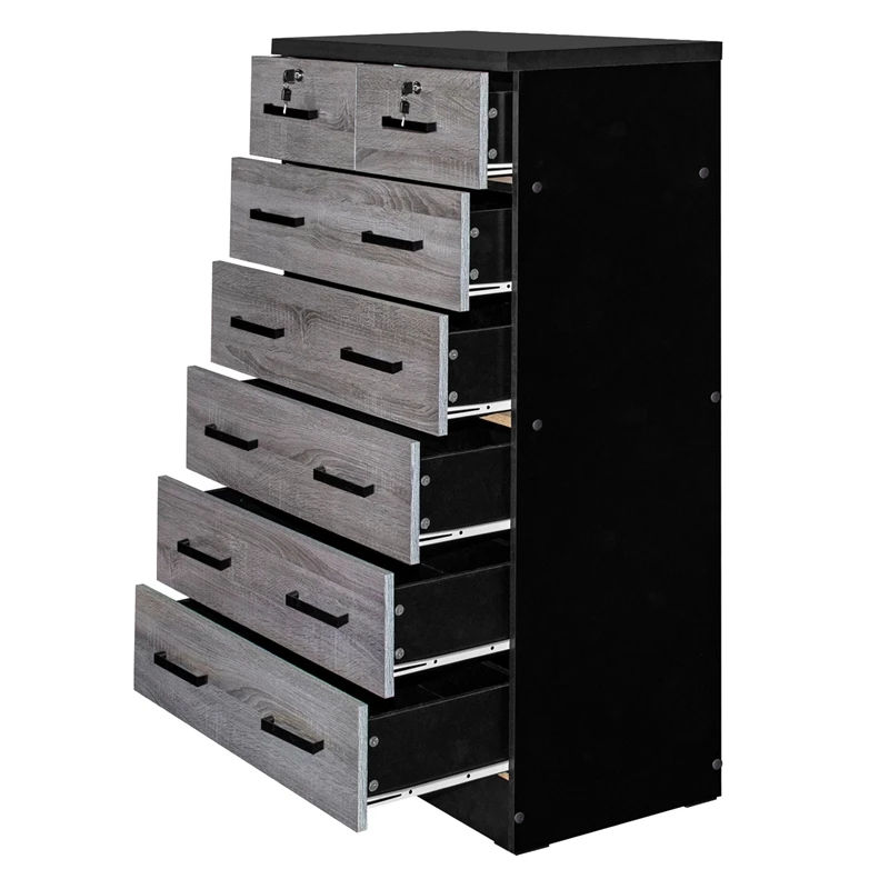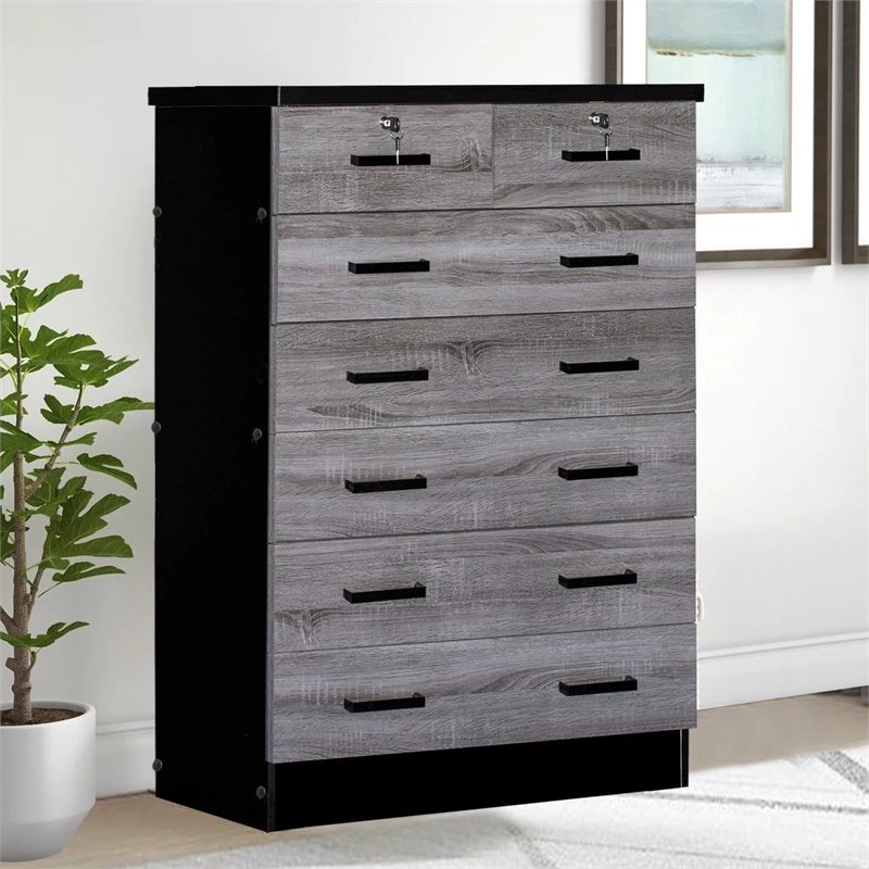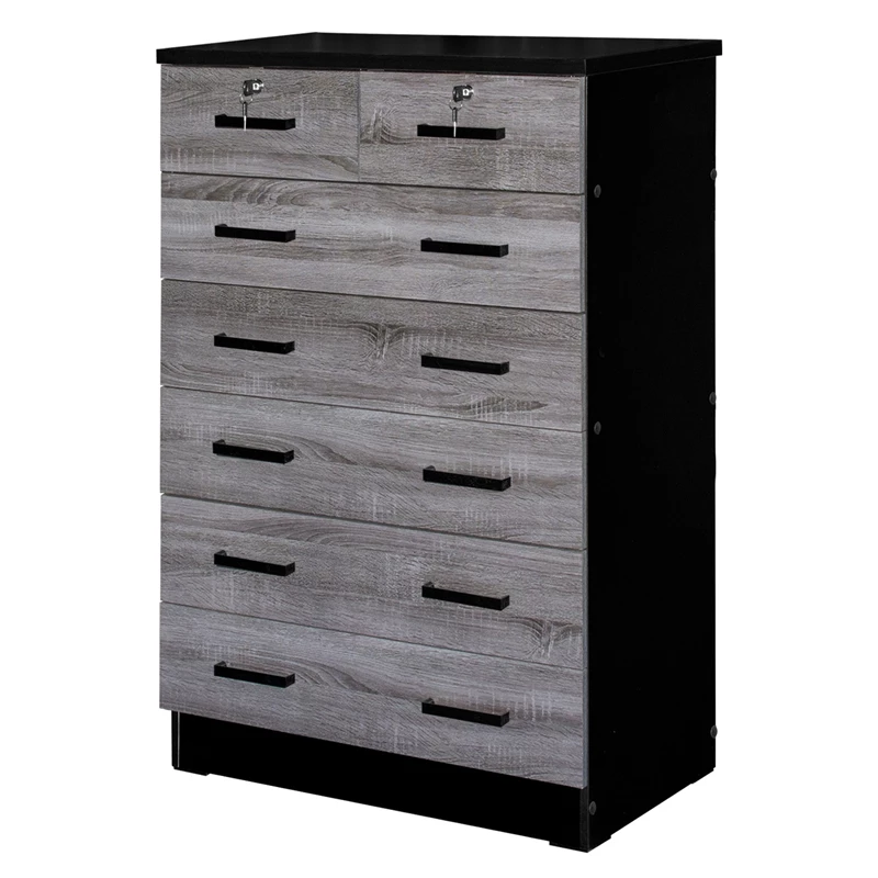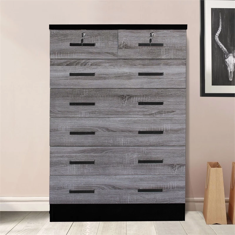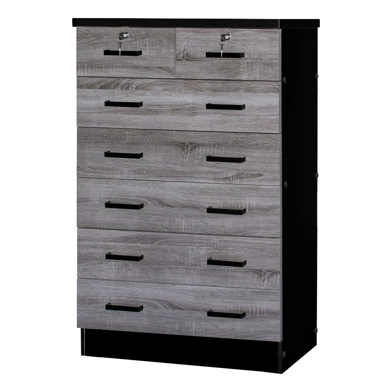 Better Home Products Cindy 7 Drawer Chest Wooden Dresser with Lock offers a timeless look with ample storage. It will pair easily with any interior theme and live through any remodels- making this the perfect dresser for anywhere in your home! Made of premium fade resistant laminated engineered wood this chest of drawers offers 5 large drawers with 2 small lockable drawers on top it is perfect for organizing your belongings in each compartment. In addition, this dresser can live in any bedroom in your home due to minimal design and practical storage. Enjoy opening your drawers smoothly and quietly- these drawers feature metal slides on each side and black plastic bar handles for easy use. Up the drama by topping this simply chic chest with an abstract sculpture and large framed family photos. Available in Natural Oak, Black, Mahogany, White, Gray, Natural Oak + Dark Gray, Gray + Black and Gray + White color options.
