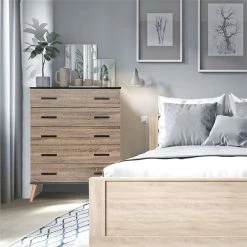 Style and function come together with this artfully designed Better Home Products Eli Mid-Century Modern 5 Drawer Chest. Crafted from laminated engineered wood, this chest of drawers features 5 thoughtfully sized drawers that runs on metal slides with safety stop offering plenty of storage for all your items. The contrasting tapered legs in natural finish are made from solid wood for extra stability and long-lasting support. The bottom floor-protecting plastic pads prevent scratches and reduce heavy pressure on the floor. Combination color finish, and large black plastic bar handles complete the look making this a great piece for your bedroom, living room, or entryway. Available in Dark Gray & Honey Oak, Black & Light Gray, Dark Gray & Natural Oak, Walnut & White, White & Natural Oak, Charcoal Oak & Silver Oak, Black & Sonoma Oak combination color finish. Assembly required.