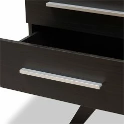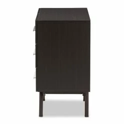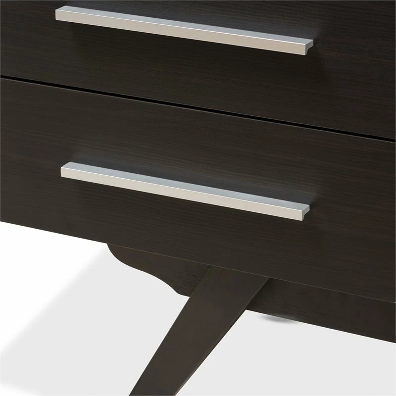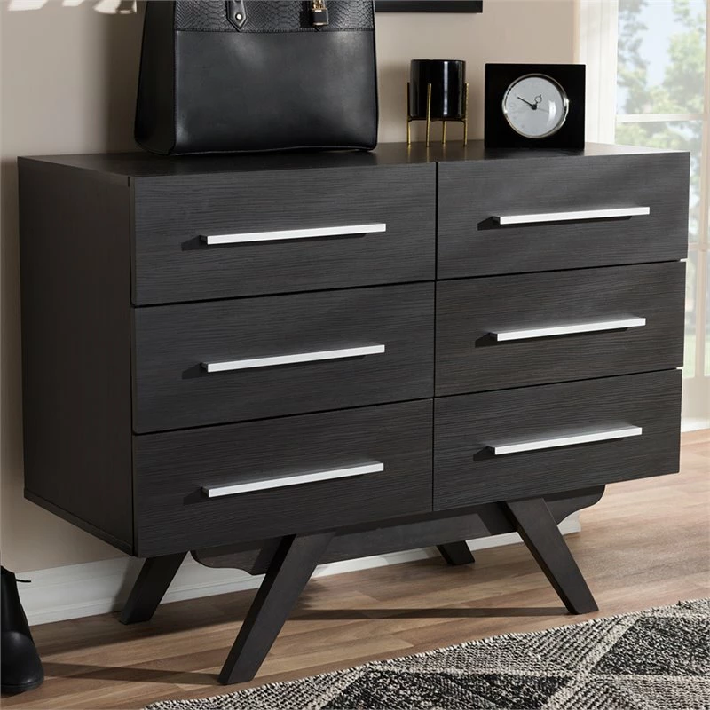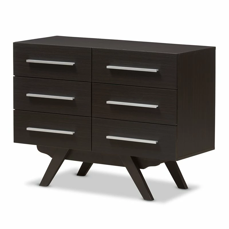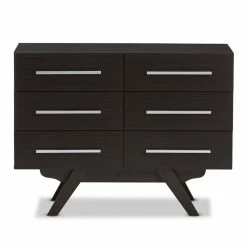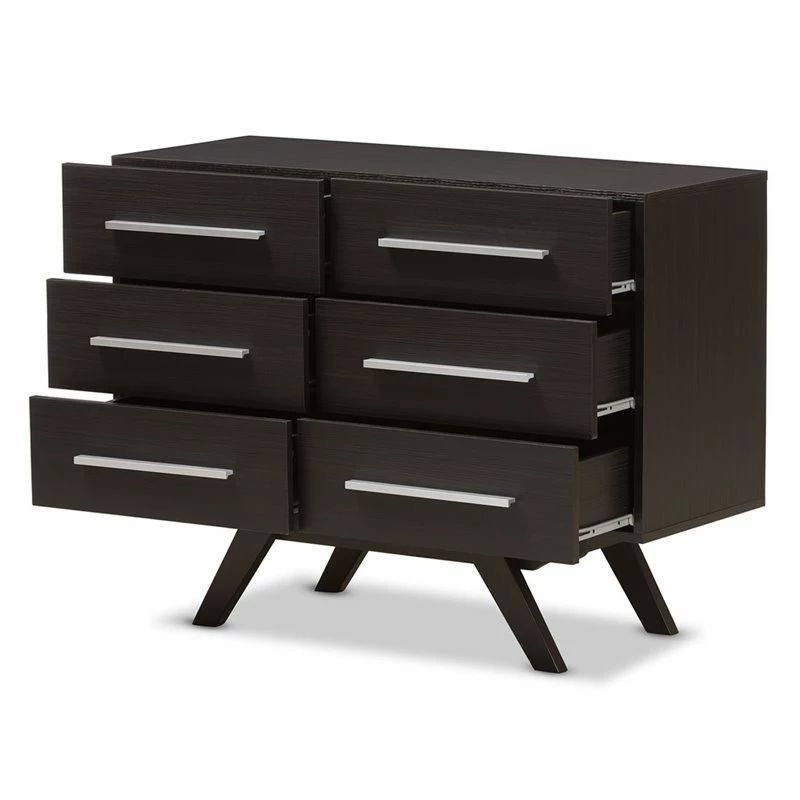 Sleek design with angular legs for sculptural design balancing, the Bowery Hill 6-drawer dresser presents your everyday space with ample storage. Constructed of engineered wood and MDF boards for sturdiness, the dresser features six drawers, on pre-install drawer slides for your clothes and linens. Powder-coated handle offers a sleek and modern aesthetic in your space. Solid rubber wood legs provide strong structural supports. Walnut or espresso brown veneered finishing complements a range of interior palettes and styles, from retro and Scandinavian to coastal and urban styles. Made in Malaysia.