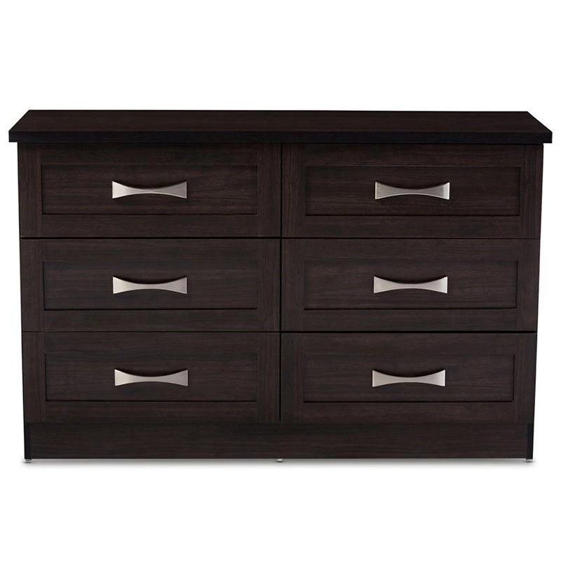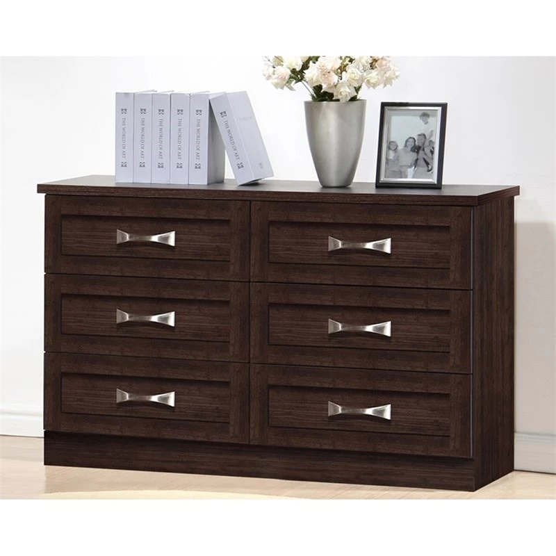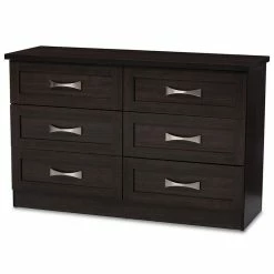 Organize your interior with the 6-drawer Dark Brown Finish Wood Storage Resort. Its streamlined drawers and table-top offering modern style with minimal fuss. Made from high-density engineered wood boards for long-lasting strength and a sturdy form, with quality runners for smooth functionality. Covered with a espresso brown PU veneer finish for a smooth, stylish and easy-to-maintain surface. Design features six large drawers, each with a metal handle, providing your bedroom with generous clothes or bedding storage space. Simple design lines and dark-wood palate combine to create a traditional piece that works well in a range of different interior styles. Made in Malaysia, the storage dresser requires assembly.