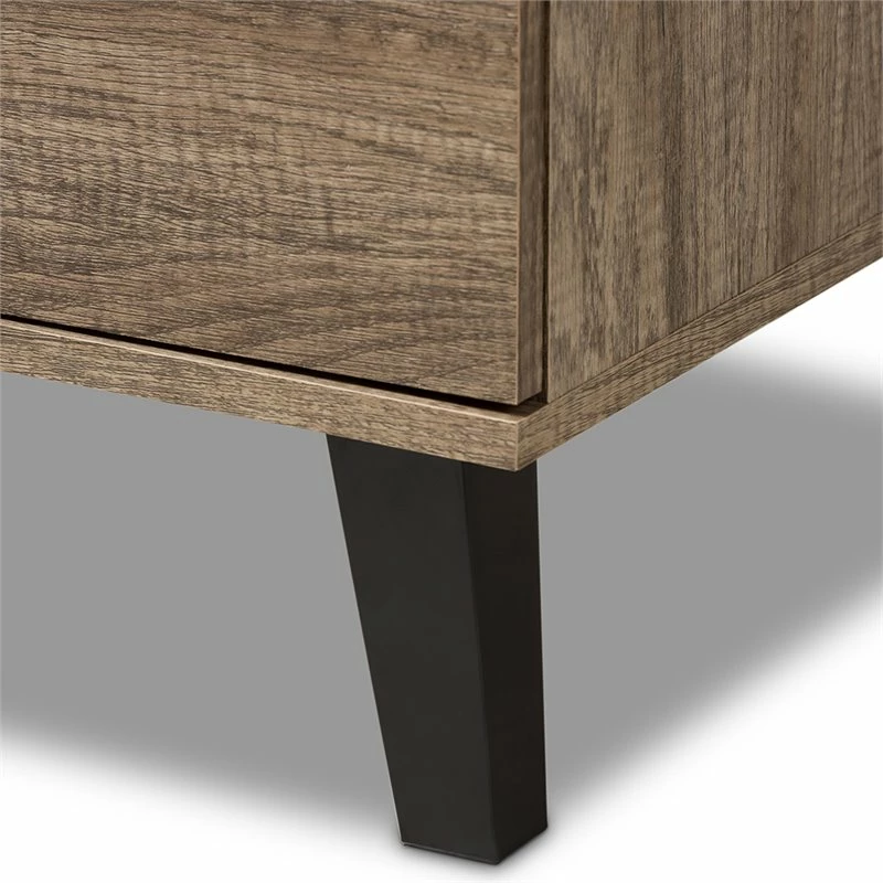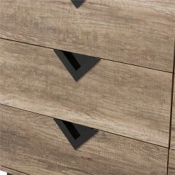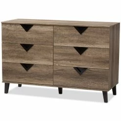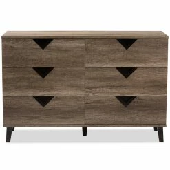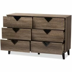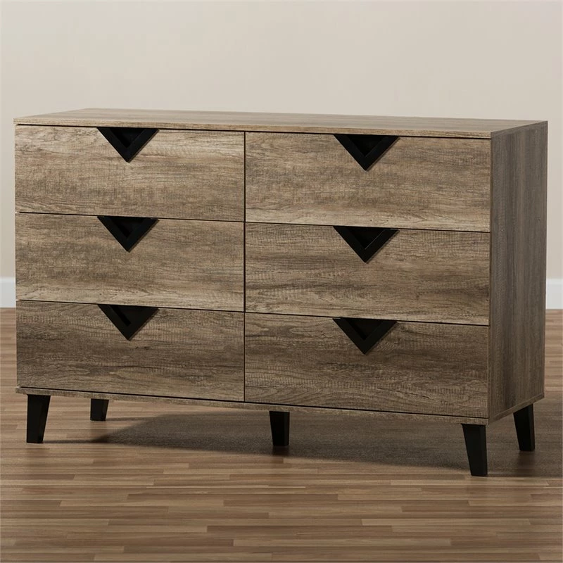 The Bowery Hill 6 drawer dresser combines function and modern style. On a geometric silhouette, this oak veneered dresser features six drawers with black triangle vinyl handles. Angled, black legs support the Bowery Hill dresser while contrasting with the oak veneered finishing. Constructed of engineered wood, the dresser is built to last. The dresser comes with six pull-out drawers on metal runners for a smooth movement for your clothes and linens. The under clearance area allows you the dust as often as you like to keep the area clean.
