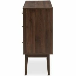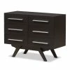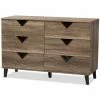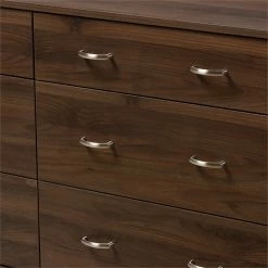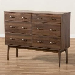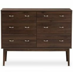 Robust design with minimalist detailing for a handsome form that balances wood finishing with modernism, the Bowery Hill 6 drawer dresser complements a range of interior aesthetics from colonial to contemporary for versatile styling. Constructed of engineered wood and MDF boards for sturdiness, the dresser features six pull-out drawers on metal runners for a smooth movement for your clothes and linens. Finished in walnut brown veneer for an alluring woodgrain, the dresser is accented with sleek metal handles for simple functionality with contemporary looks. Solid wood angled legs in a tapered design, for a scandinavian touch in your decor hold up the dresser sturdily.