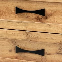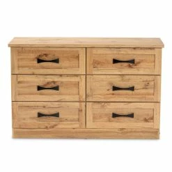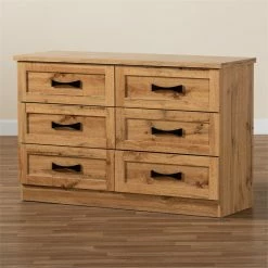 Organize your interior with the Bowery Hill dresser. Made in Malaysia, this sturdy piece is constructed from high-density engineered wood boards for long-lasting strength along with quality runners for smooth functionality. The natural oak brown finish injects visual warmth to your space while complementing a variety of modern room layouts. Requiring assembly, the dresser features six large drawers to efficiently organize clothes, linens, and more. Black finished metal drawer handles add a sleek, contemporary touch, characterizing the dresser as a sophisticated solution to modern bedroom storage.