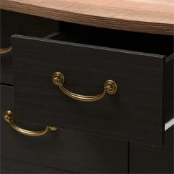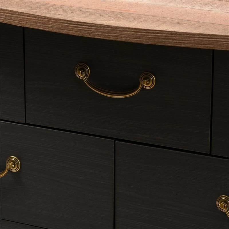The Bowery Hill 7-drawer dresser is an exciting spin on a traditional look. The country cottage and farmhouse-inspired design is evident in the serpentine curves of the frame and attention to detail. The two-tone finish is where the updated look of this dresser comes in. The sides and drawers of the dresser are finished in black, contrasting and complementing the oak finish of the wings and top of the dresser. All seven drawers of the dresser easily pull out on rolling slides. The drawer features charming gold-finished metal drawer pulls with ornate grooves for extra detail. The dresser is dynamic and can be coordinated with a wide range of decor, from rustic and French styles all the way through contemporary. Add this versatile charm to your bedroom, guest room, nursery, or any space needing storage and style. Made in Malaysia, requires assembly.