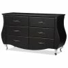 Crystallize your decorating vision with our Wood Contemporary Upholstered Dresser. Sporting faux crystal buttons and drawer pulls plus chrome-plated steel legs, this bedroom-furniture piece positively shines. Black faux-leather padded exterior features soft-edged top corners for a contemporary, contoured appearance. Six drawers offer plenty of storage space. Wooden-frame construction provides outstanding durability.