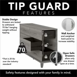 Create a relaxing atmosphere in your bedroom with the dependable yet soothing Bush Furniture Somerset 6 Drawer Dresser. Designed with your safety in mind, all six drawers have been rigorously tested with a 70 lb. weight to surpass industry standards for stability on hard and carpeted flooring. The innovative Open-Safe mechanism takes stability a step further by preventing more than one drawer per side from pulling out at a time, and a wall anchor is included with the horizontal dresser to provide even more security. The Dresser’s drawers also feature smooth ball bearing slides that stop when fully extended to keep them from being removed unintentionally. This bedroom dresser has been meticulously tested to meet or exceed industry standards for safety, durability and performance and is backed by the Bush Furniture 6 Year Manufacturer’s Warranty. American made with U.S. and imported parts.