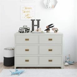 Create a space that is fun and sophisticated with the delightful Miles 6-Drawer Dresser by Baby Relax. Combining campaign and modern style, this charismatic dresser is crafted with a sturdy wood construction and includes six spacious drawers. Transform this dresser into a delightful changing table with the purchase of the Baby Relax Miles Dresser Topper. From functionality also sprang great design with modern features such as clean lines, a fresh classic grey finish, and aged brass sunken metal pull drawer handles. Combine the Miles 6-Drawer Dresser with the rest of the Baby Relax Miles collection to design a playfully sophisticated nursery room that will live, move, and grow alongside your child.
