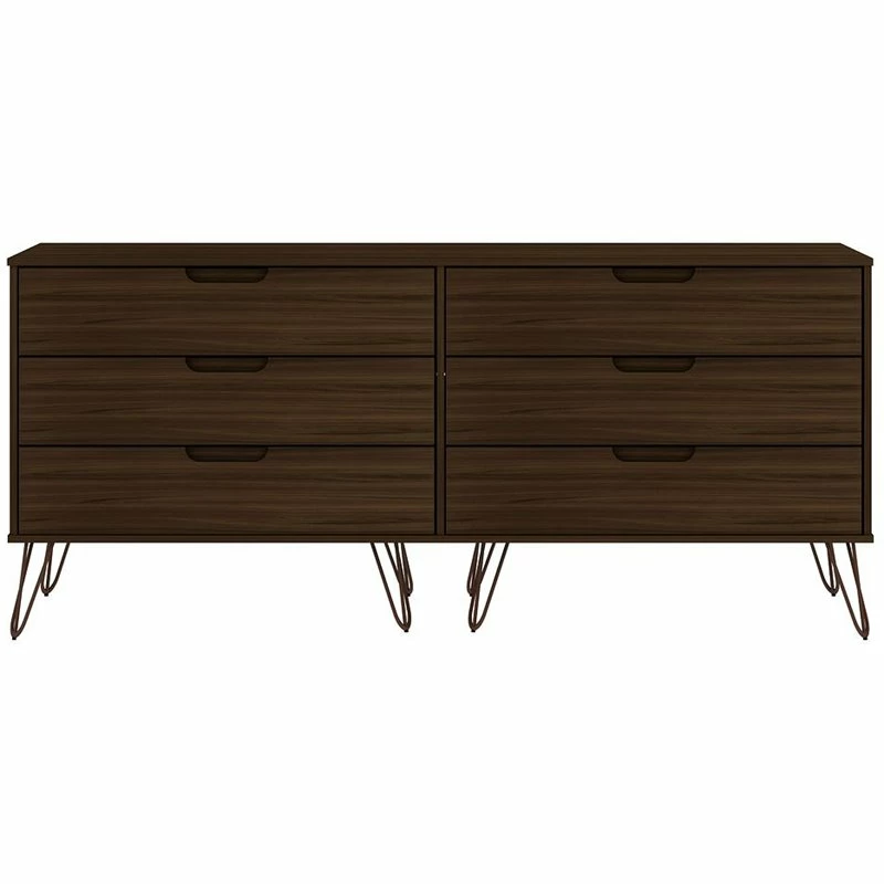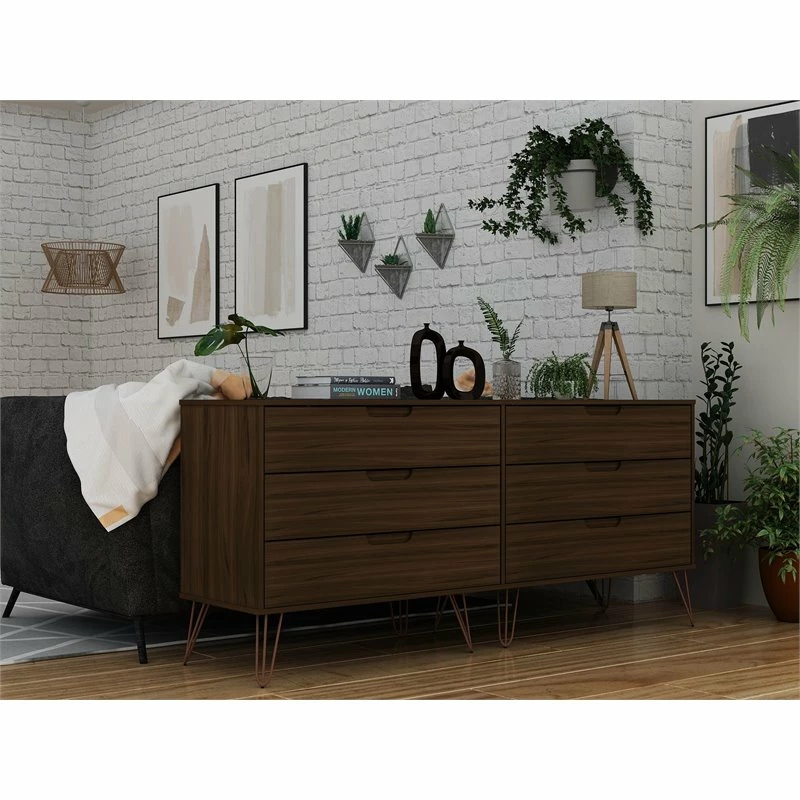The Eden Home double dresser is the perfect accompaniment to any bedroom space, with ample storage and minimalistic Mid-century modern style. Cutout handles keep the piece feeling fresh with 6 drawers made easy for stowing away clothing, personal items, and beyond. A display top allows for sharing favorite framed family photos, travel trinkets, perfume trays, or a decorative lamp. Set it under a mirror or painting to complete your space with this instant bedroom focal point.