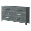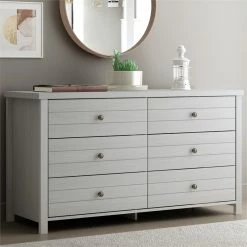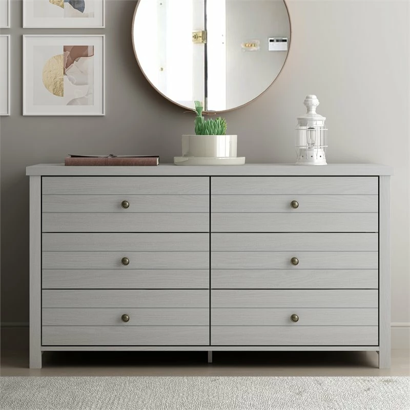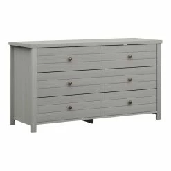 Fusing together a stylish, clean aesthetic and ample storage space, this wooden six-drawer dresser will instantly freshen up your bedroom or living space. A simple silhouette and clean gray finish are fashionably on-point while contrasting dark metal drawer pulls add visual interest. Smooth-gliding drawers make organization easy while durable, high-grade materials mean your new trendy dresser will last for years to come. With an expansive surface area, this dresser is perfect for showcasing lovely accessories and precious heirlooms. Assembly required.
