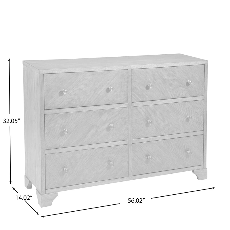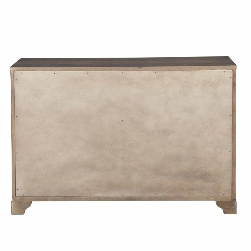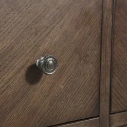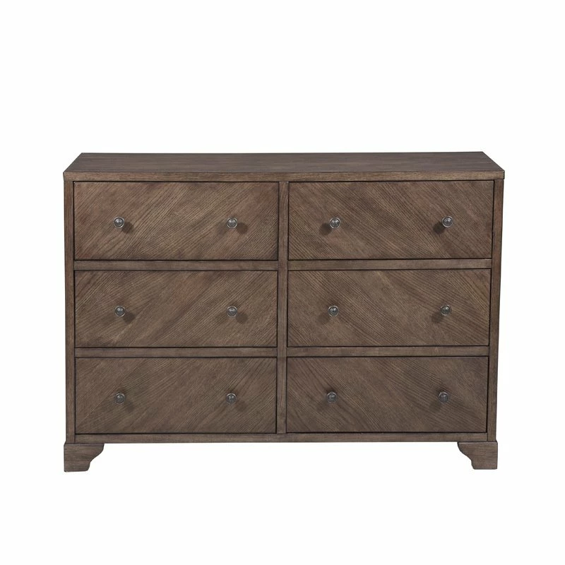 A study in simplicity, this accent chest features traditional farmhouse styling and six drawers offering generous storage space. A warm brown finish on flat cut oak veneers adds subtle visual interest, as does the burnished brass hardware.Farmhouse style dresser with six drawers.Warm brown finish on flat cut oak veneers.Constructed of hardwood solids and veneers.Six drawers for storage with full extension side guides.Textured and burnished brass finished hardware