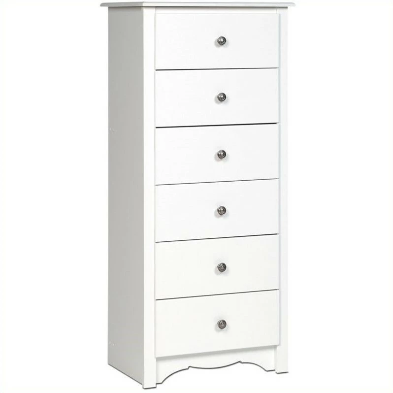 The Versatile White Wooden 6 Kingfisher Lane Lingerie Drawer Chest features a profiled top, decorative moldings and a scalloped apron. Reminiscent of Shaker style, it will be the perfect addition to a bedroom with a country, contemporary or traditional décor. Space saving and slender design, making this popular style a great addition to any room.