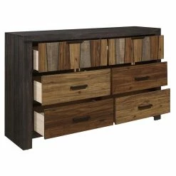 The distinct styling of the Cooper Collection will be the perfect fit for the modern industrial look you wish to achieve in your bedroom. Utilizing embossed faux-wood veneer, the unique 4-tone style of the dresser, accentuates highs and lows of dark and light acacia as well as the rich tones of dark ebony and rustic mahogany faux grains. Dark metal hardware provides complementing contrast to the drawer fronts.