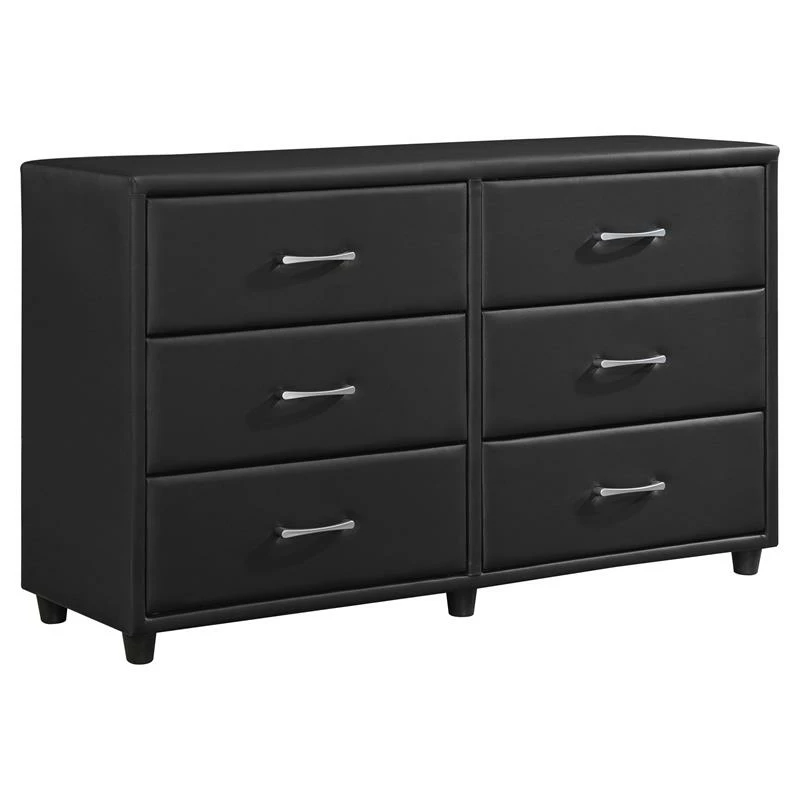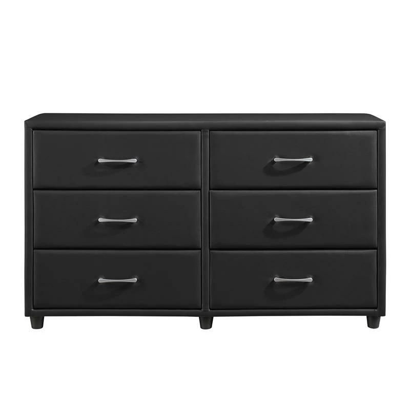 The contemporary design of the Lorenzi Collection is enhanced by the addition of the durable black vinyl covering that encases the dresser of the collection. Painted gray hardware provides a distinct contrast to the bi-cast vinyl covering. Scaled for urban living, this collection will prove to be a unique and stylish addition to your bedroom.