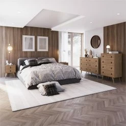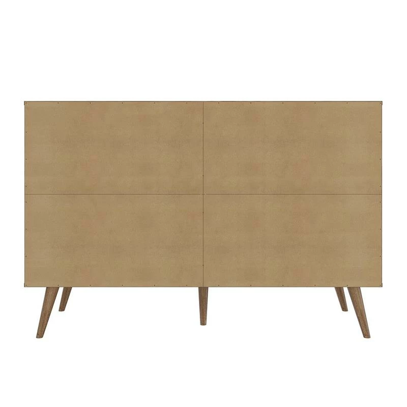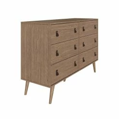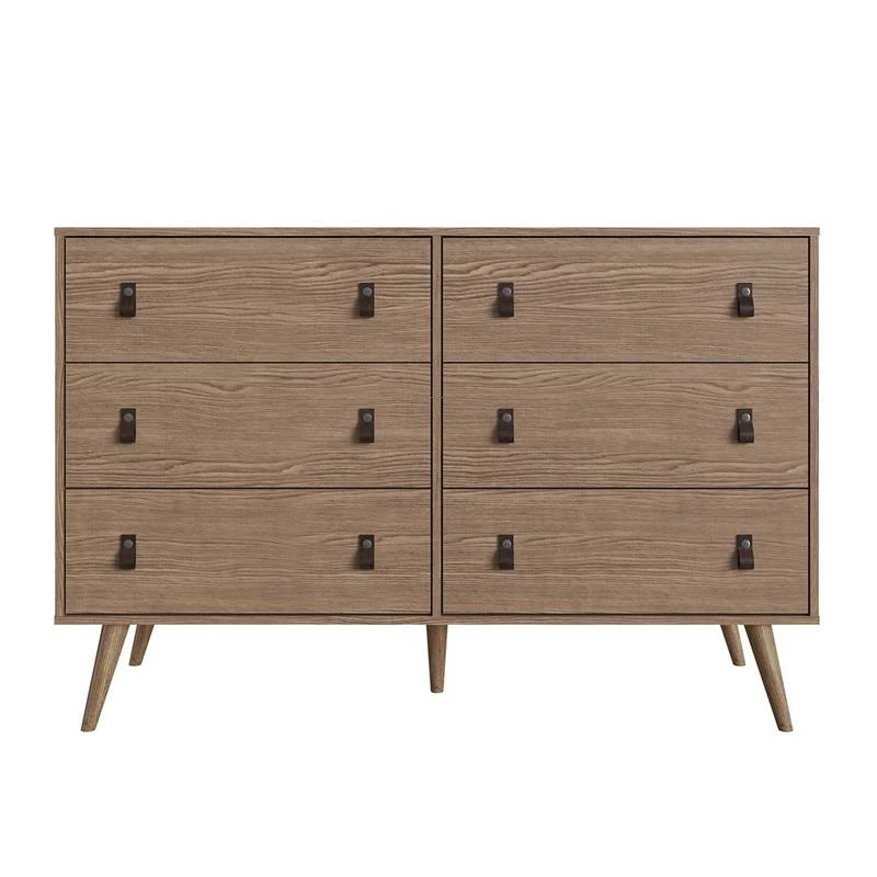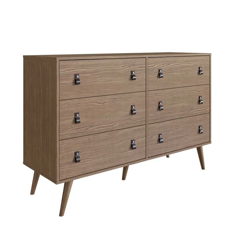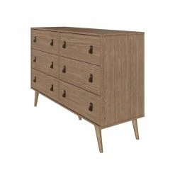 Streamlined design and stunning, modern details come together in one clean and extraordinary piece. The Amber double dresser brings mid-century modern design and a sleek and unique look, that updates any bedroom. Careful, quality craftmanship is seen throughout the piece, with solid wood legs and clean lines. Six drawers offer ample storage space. Faux leather button pull loops replace the standard handle, offering a fun and stylish twist to tradition. Offered in four shades, white, nature, white and blue, and blue and nature to compliment any styled home!