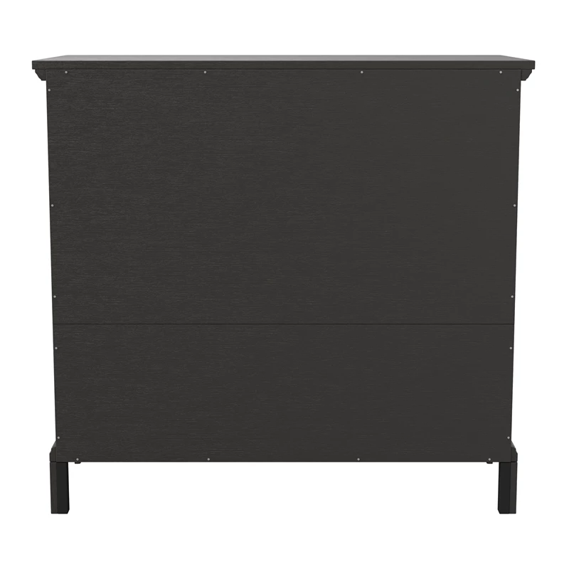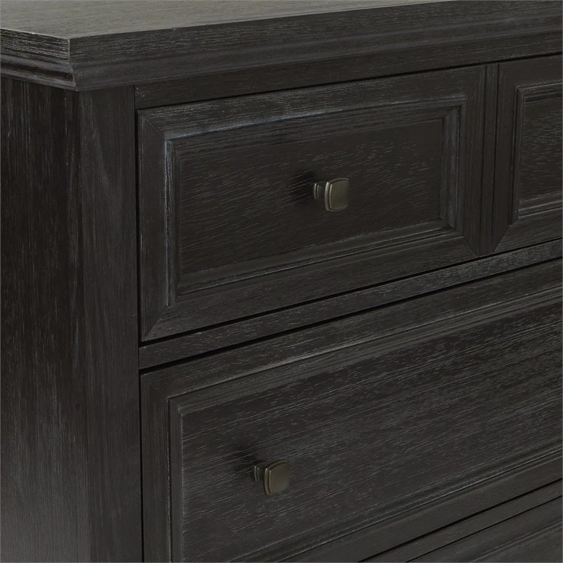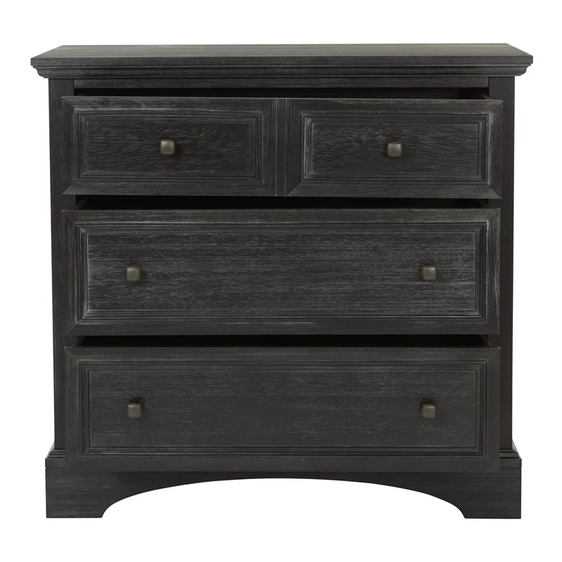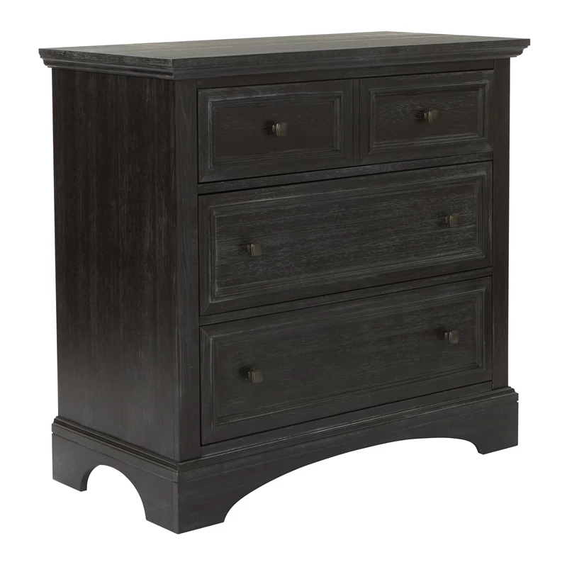 Farmhouse Basics 3 Drawer Chest in Rustic Black by OSP Home Furnishings A simple design inspired by the farmhouse look, yet transitional enough to fit any décor. The wire-brushed finish allows the dusty white overcoat to replicate a slightly weathered look into the deep grained wood veneer. Designed by an award winner furniture designer Constructed of Mahogany with Albizia wood veneers with a six-step finishing process applied. The felt-lined top drawer is the perfect place to store delicates or jewelry. The middle and bottom drawers can accommodate deep storage needs. All drawers have heavy-duty metal side glides for ease of opening and closing.