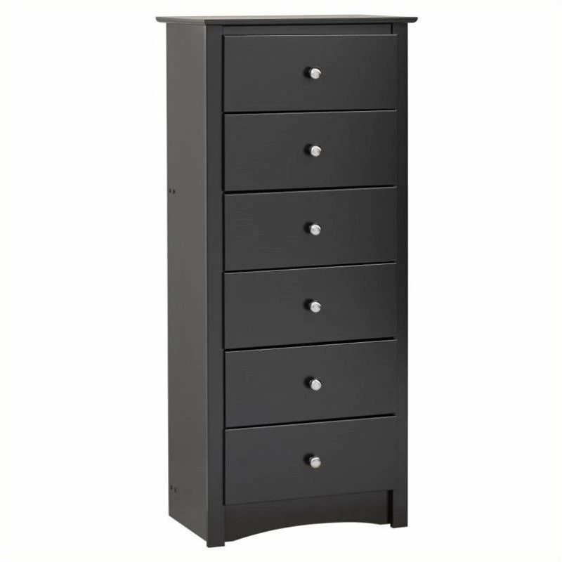 The versatile Black 6 Drawer Chest features a profiled top, decorative moldings and an arched apron. With modern design touches such as solid brushed nickel accents, it will be the perfect addition to a bedroom with a country, contemporary or transitional decor.