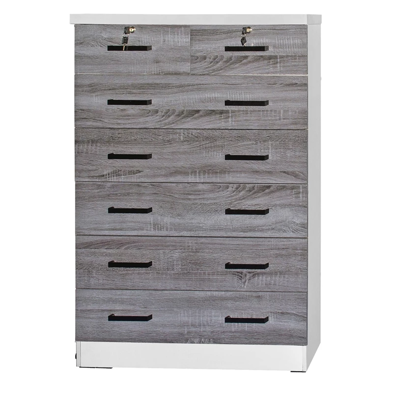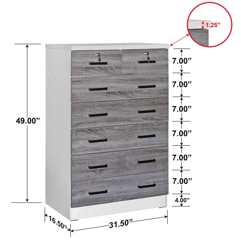 Pemberly Row 7 Drawer Chest Wooden Dresser with Lock offers a timeless look with ample storage. It will pair easily with any interior theme and live through any remodels- making this the perfect dresser for anywhere in your home! Made of premium fade resistant laminated engineered wood this chest of drawers offers 5 large drawers with 2 small lockable drawers on top it is perfect for organizing your belongings in each compartment. In addition, this dresser can live in any bedroom in your home due to minimal design and practical storage. Enjoy opening your drawers smoothly and quietly- these drawers feature metal slides on each side and black plastic bar handles for easy use. Up the drama by topping this simply chic chest with an abstract sculpture and large framed family photos. Available in Natural Oak, Black, Mahogany, White, Gray, Natural Oak + Dark Gray, Gray + Black and Gray + White color options.