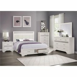 The unique styling of the Pemberly Row Collection presents a glamorous option for your bedroom. The dresser’s 3D printed paper veneer features a white finish that allows for the acrylic silver glitter front of the hidden jewelry drawer to shine. The jewelry drawer features felt lining to protect your hidden items from wear and tear. Polished chrome bar drawer pulls front the drawers providing complementing contrast to the collection’s finish.