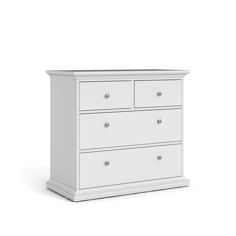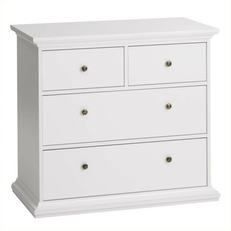 Pemberly Row 4 Drawer Chest offers space saving alternative that can hold a variety of items in its four drawers (2 small top drawers & 2 large bottom drawers), from guest linens to daily entryway necessities. The unique depth makes this piece an ideal addition to bedrooms, living areas, or entryways. Adorned with top and bottom molding, rounded bronze colored metal hardware, metal drawer glides and a fade resistant foil surface that is easy to clean this unit brings out a romantic flair while still functioning as an organizational hub for your living area. Combine the Pemberly Row 4 Drawer Chest with coordinating Pemberly Row items to complete the look.
