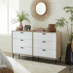 Bring a chic modern look to your bedroom with this 6-drawer dresser from Pemberly Row. This bedroom dresser features six large drawers that open and close on smooth metal runners with safety stops for easy access storage of a variety of different items like stacks of denim jeans, your favorite blouses, or comfy sweatshirts and your collection of pajama pants. There’s room for anything you could imagine. This modern dresser also offers a spacious top surface that provides additional space to display bedroom items like your room spritzer, makeup, photos of your loved ones, and more. This wood dresser is accented with leather pulls on drawer fronts for added texture and style. Perfect for the master bedroom or guest room, this bedroom furniture features a tip restraint safety strap for peace of mind. Finished in Sky Oak with White accented drawer fronts, this dresser upgrades any room it is in.