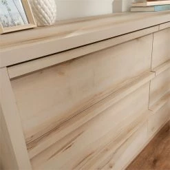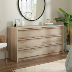 A mid-century modern dresser in a light finish is the fresh addition to your bedroom that you have been looking for. The 6-drawer dresser from Pemberly Row offers stylish storage and easy function. This bedroom dresser features six spacious drawers that open and close on smooth metal runners, perfect for storing the bulkiest denim and thickest sweaters, as well as extra bed sheets and household linens. The top surface of this double dresser holds your home décor, candles, box of jewelry, and morning cup of coffee as you get ready for the day. Say goodbye to clunky metal knobs, this modern bedroom dresser features subtle, wood drawer pulls. Use this bedroom furniture in any room of your home: the master bedroom, guestroom, or even the hallway for stylish around-the-house storage. The Pacific Maple finish with a contemporary look brings the best of both worlds to your bedroom routine.
