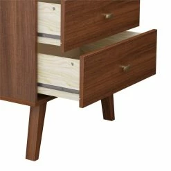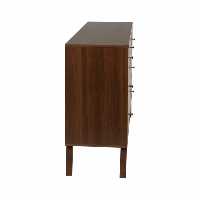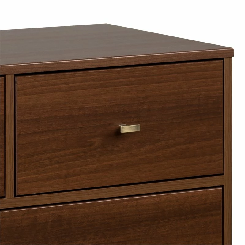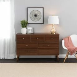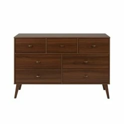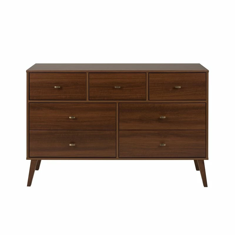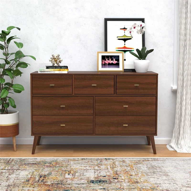 The Pemberly Row 7-Drawer Dresser is a modern take on a retro look, with a sleek mid-century modern design that adds a touch of vintage to your bedroom. Three small drawers on the top row are well suited for personal clothing, while the 4 large lower drawers have ample room for sweaters and larger items. All seven drawers run smoothly on metal glides, offering easy access to storage for clothing and bedroom items. The tapered solid wood legs and inset drawers deliver a clean and modern look to your bedroom. Brushed brass finished knobs add to the retro-chic design for a functional and fashionable dresser.