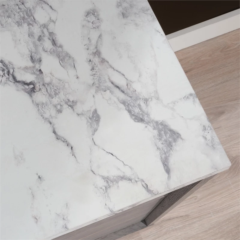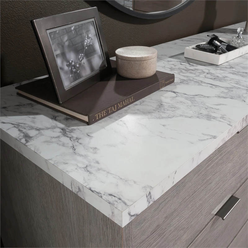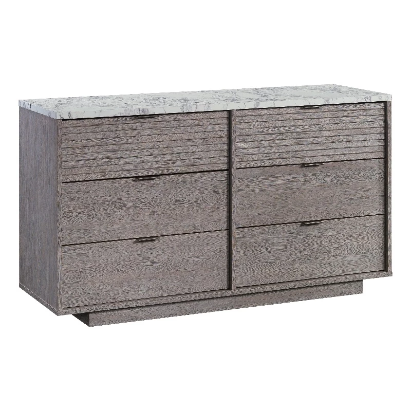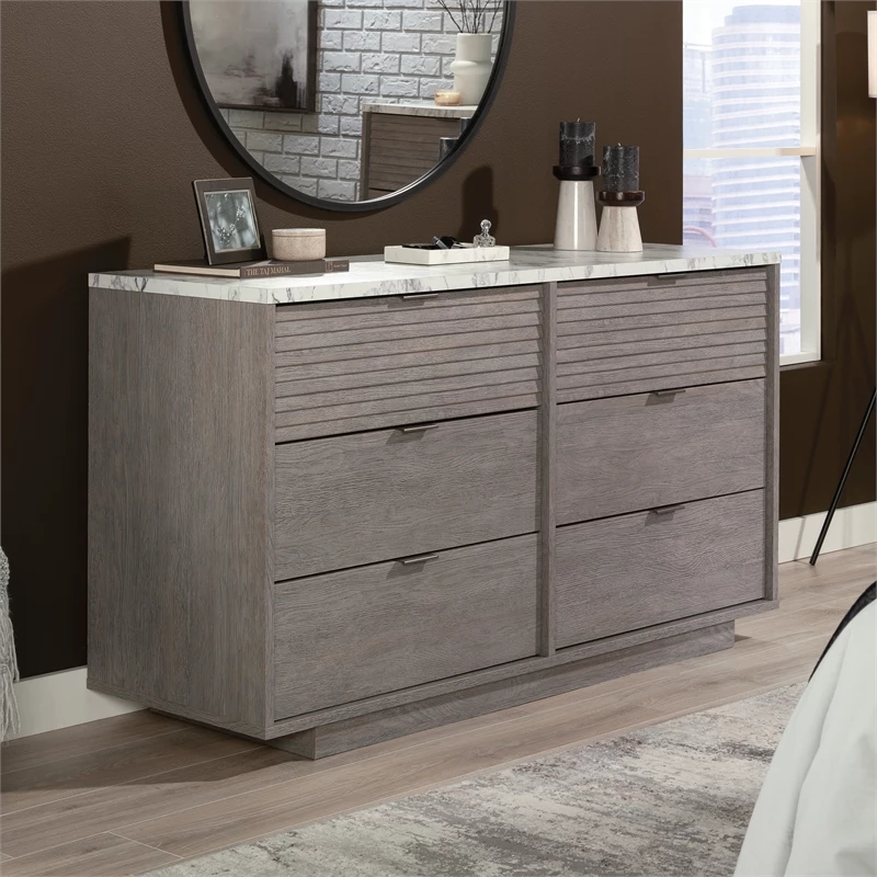 Bring the details of modernity to the bedroom with this dresser from the East Rock™ collection. This bedroom dresser features six drawers that are large enough to fit your bulkiest denim, largest sweaters, and even bed linens. This 6-drawer dresser features drawers that open and close on smooth metal runners and are ideal for stashing away anything from your abundance of flannel shirts to your hidden collection of vintage shirts and pajama pants. This contemporary dresser has room for a wide variety of items. The roomy top surface also makes a great place to display all your bedroom essentials like an accent lamp, your makeup bag, a mirror and pictures of your family and friends too. Assembly is a breeze with a T-lock drawer system, so you can spend more time styling your double dresser and less time assembling. Finished in Ashen Oak™ finish with high-wear DuraGraph™ faux white marble accent, this dresser with drawers adds style and storage to your home.
