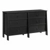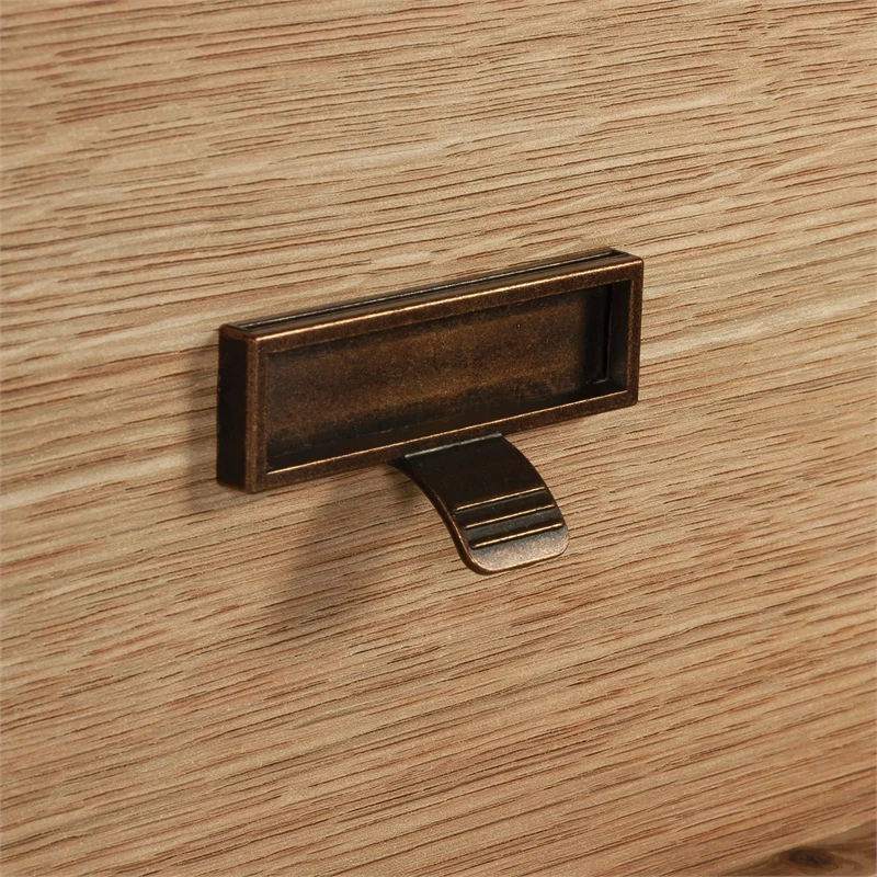 A unique, architectural-driven bedroom furniture piece that provides beauty and function to any setting. This double dresser from the Trestle® collection offers structural angled leg design and classic hardware accents on each drawer. This dresser with drawers has six spacious drawers that open and close on smooth metal runners with safety stops. A 6-drawer dresser stores clothing of all varieties: from stacks of jeans and sweatshirts to your assortment of comfy shorts, leggings, and T-shirts. Each drawer front is detailed with attractive period hardware that gives it an extra touch of style. And to save you time, the drawers utilize a T-lock assembly process. This bedroom dresser has a spacious top surface that provides additional space for other bedroom essentials like a mirror, bottles of perfume, or jewelry box. Or display home décor items like framed photos, a lamp, or candles. Finished in a warm Timber Oak®, this dresser provides a storage option for the bedroom or any other place you need a solution.