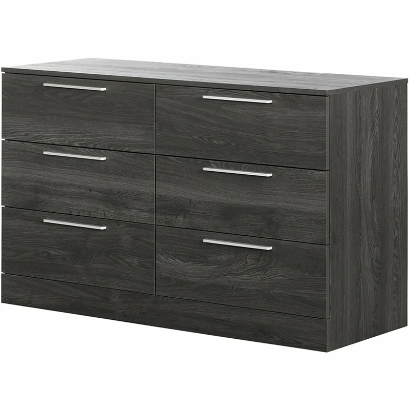 This modern style dresser gives you functional storage and very simple lines so you can now get that sleek look for your bedroom.Drawers are an easy way to see what’s in the chest – and putting things away is simple, so it doesn’t look like your clothes were left all over the room. A six drawer dresser is the ideal companion piece to an armoire. Because the slides are made of metal, each drawer can hold up to 25 pounds.Another very useful feature of this chest – aside from the handy drawers – is the large top surface. Since the piece itself is lower, the top is within easy reach and large enough to hold lots of things. It’s a favorite place for decorative items and those body care products you use all the time.South Shore is proud to stand behind this 6-drawer double dresser storage unit with an exclusive 5-years limited guarantee. Shop with confidence knowing your purchase is always covered. All our products meets or exceeds North American safety standards and our packaging are tested and certified to reduce the risk of damage during shipment. There is a wall anchor kit included in the box to prevent tip-over incidents, thus ensuring your family’s safety. This item is shipped in 1 box, make sure to have a friend with you. Assembly is required by 2 adults and tools are not included. If you have questions regarding this product or need assistance do not hesitate to contact South Shore Furniture 7 days support. This product is made in North America with laminated particleboard. Accessories not included.