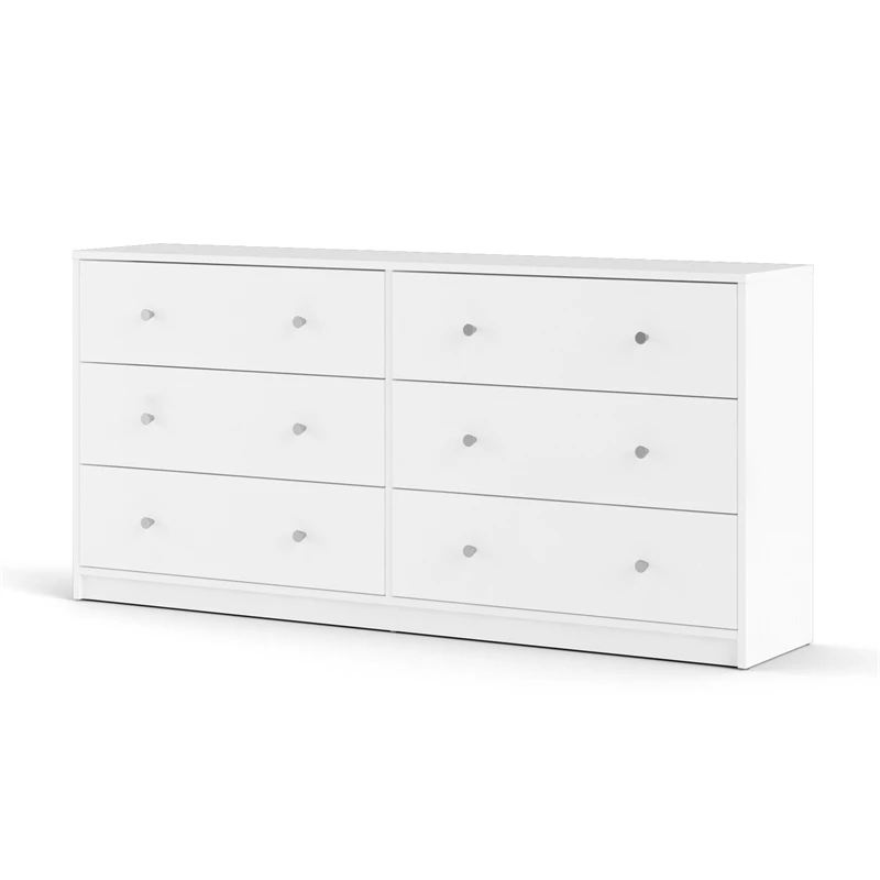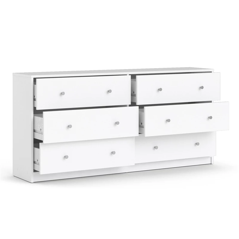 Organize your wardrobe with the Portland 6 Drawer Double Dresser. The simple, sophisticated design features six drawers with high sides, clean lines and a smooth finish. Equally suited for the kid’s room or master bedroom, the double dresser is a versatile piece of furniture, offering roomy storage for all your organizational needs. The Portland 6 Drawer Double Dresser is traditional Danish design and produced with a fade resistant foil surface, which is easy to clean. Combine this chest with coordinating Portland items to complete the look.