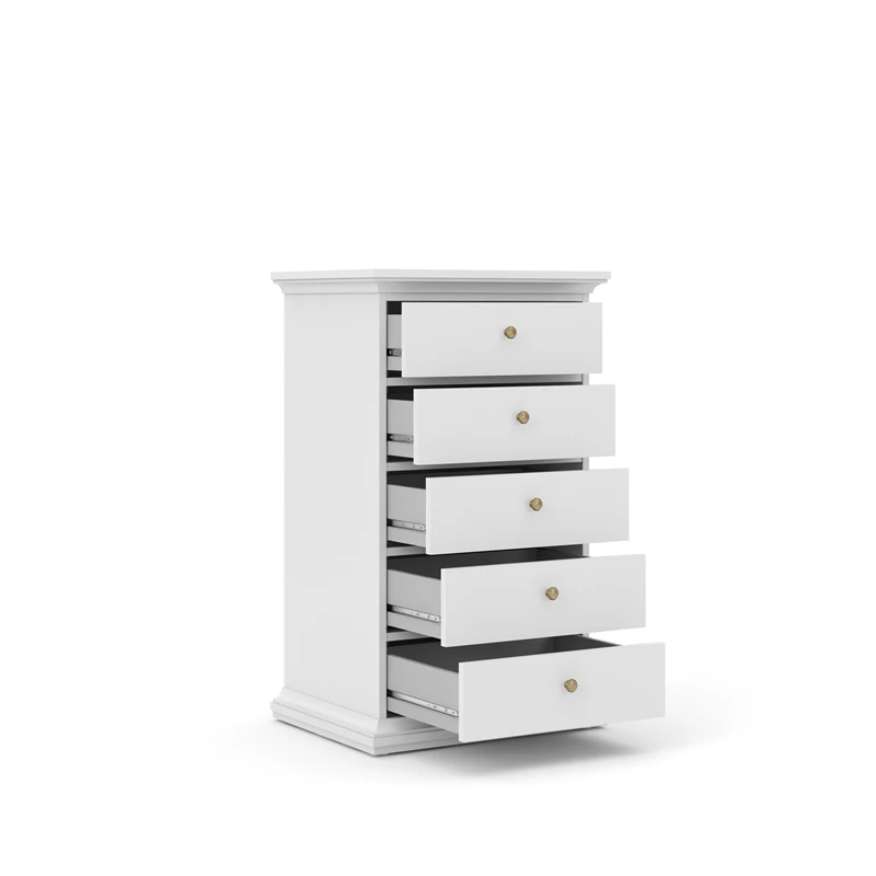 Sonoma 5 Drawer Chest offers space saving alternative that can hold a variety of items in its wide drawers, from guest linens to daily entryway necessities. The unique depth makes this piece an ideal addition to bedrooms, living areas, or entryways. Adorned with top and bottom molding, rounded bronze colored metal hardware, metal drawer glides and a fade resistant foil surface that is easy to clean this unit brings out a romantic flair while still functioning as an organizational hub for your living area. Combine the Sonoma 5 Drawer Chest with coordinating Sonoma items to complete the look.