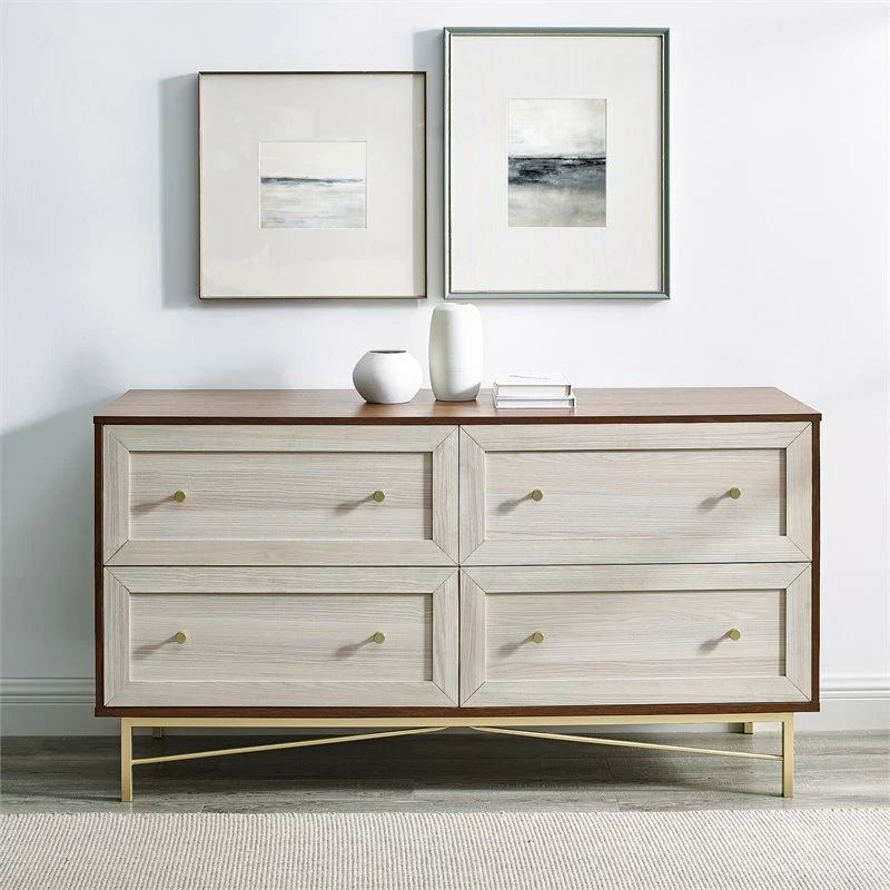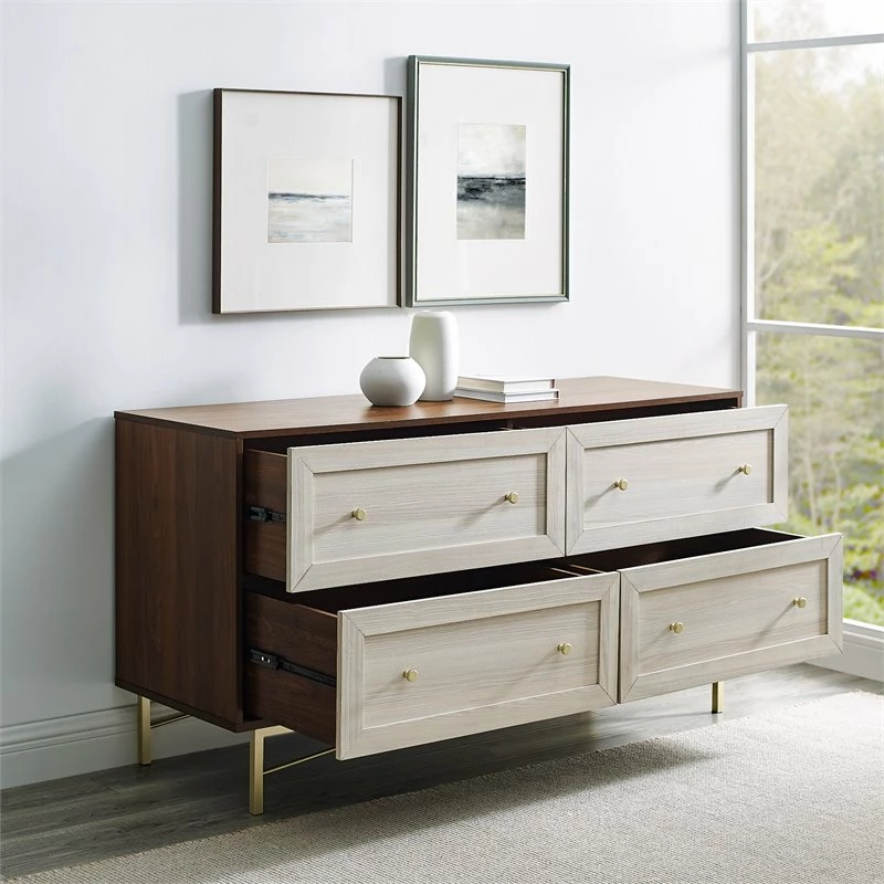 Complete your contemporary bedroom with this modern four-drawer dresser. Four spacious drawers provide plenty of extra storage for clothes, linens, or accessories. The gold metal hardware and geometric legs add tasteful hints of glam influence to this stylish chest of drawers. Capped feet reduce scratches on the floor, and each drawer is fitted with smooth, telescoping metal glides. Both make for a piece that is not only nice to look at, but also nice to use.
