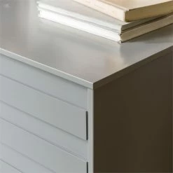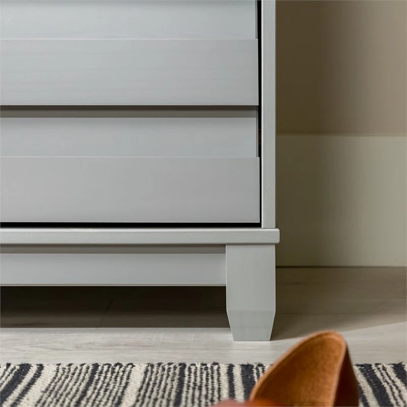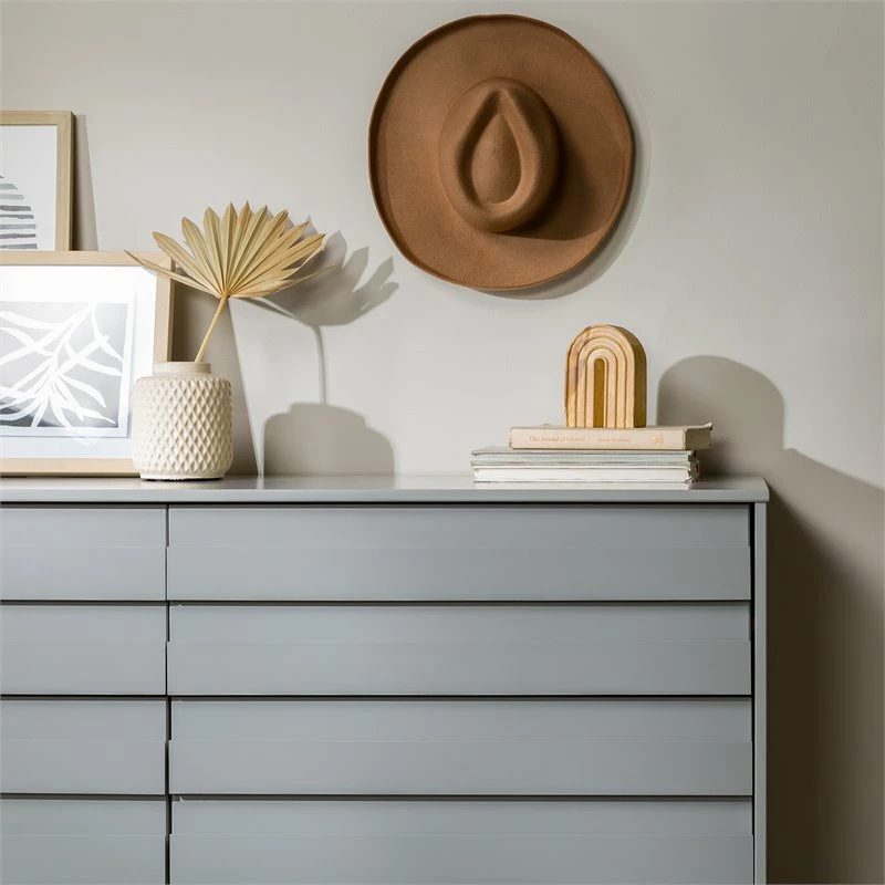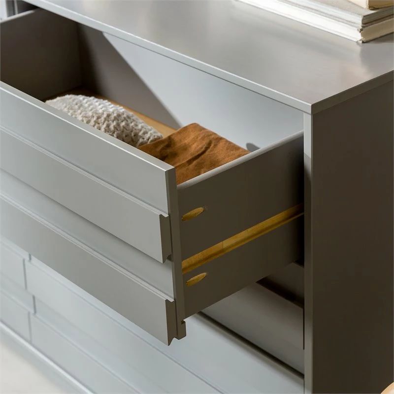 A tidy bedroom is only a few clicks away with this modern dresser. The six drawers provide plenty of storage to organize linens, clothing, toys, or jewelry. Multiple grooved pulls on each drawer offer a contemporary look and easy access to your prized possessions. The solid pine wood is responsibly harvested from renewable forests, so you can feel good about this sustainable purchase. Choose from three beautiful painted finishes to match your style.